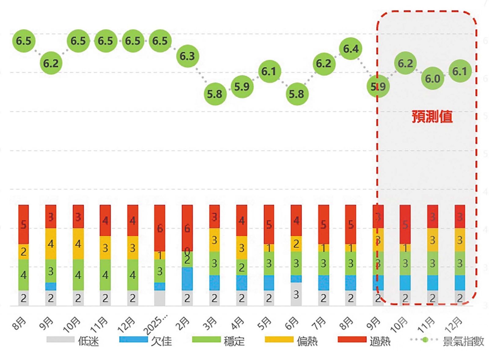 此外,就業市場保持健康,總體失業率維持在2.0%的低失業率等級。然而,內需與投資信心疲弱仍疲弱,「內地消費者信心指數」以及「本地居民貸存比」分別處於「低迷」及「欠佳」等級。本澳住宅樓價指數亦跌至192.4點,自6月起落入「低迷」等級,並持續創下近十年來的新低。經綜合分析與推算,8、9月份的經濟景氣指數分別為6.4分及5.9分,整體維持「穩定」等級。