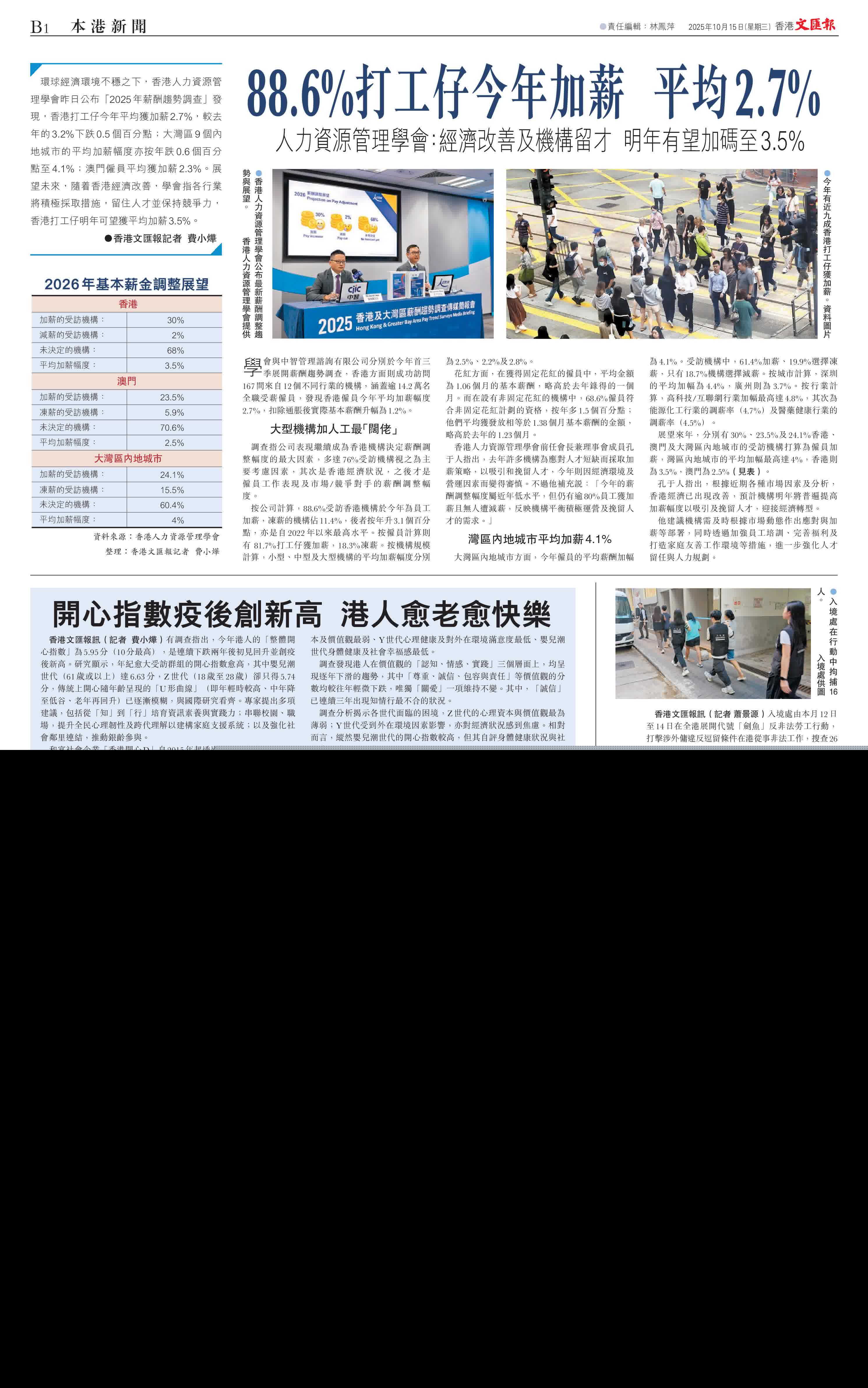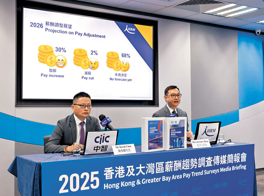 (香港文匯報記者 費小燁)環球經濟環境不穩之下,香港人力資源管理學會昨日公布「2025年薪酬趨勢調查」發現,香港打工仔今年平均獲加薪2.7%,較去年的3.2%下跌0.5個百分點;大灣區9個內地城市的平均加薪幅度亦按年跌0.6個百分點至4.1%;澳門僱員平均獲加薪2.3%。展望未來,隨着香港經濟改善,學會指各行業將積極採取措施,留住人才並保持競爭力,香港打工仔明年可望獲平均加薪3.5%。