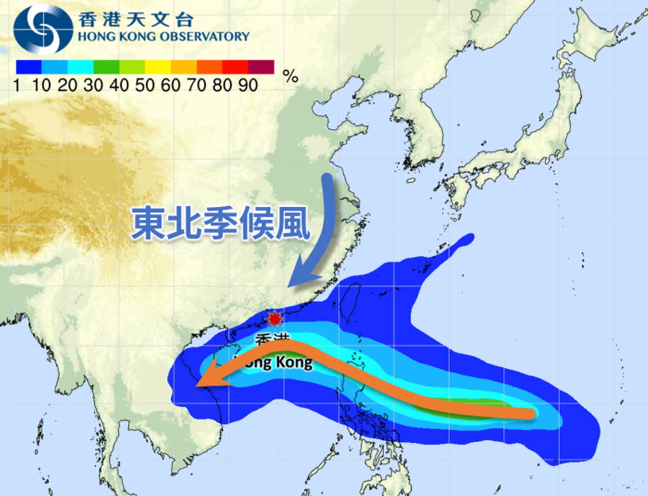 另外,天文台預測位於菲律賓以東海域之西北太平洋的對流雲團會在未來兩三日逐漸發展為熱帶氣旋,並在週末期間靠近呂宋一帶,隨後有較大機會進入南海東北部。此外,一股強烈東北季候風會在星期日(19日)抵達華南,在與潛在熱帶氣旋的共同影響下,本港下週初至中期風勢頗大,離岸及高地吹強風,氣溫顯著下降。