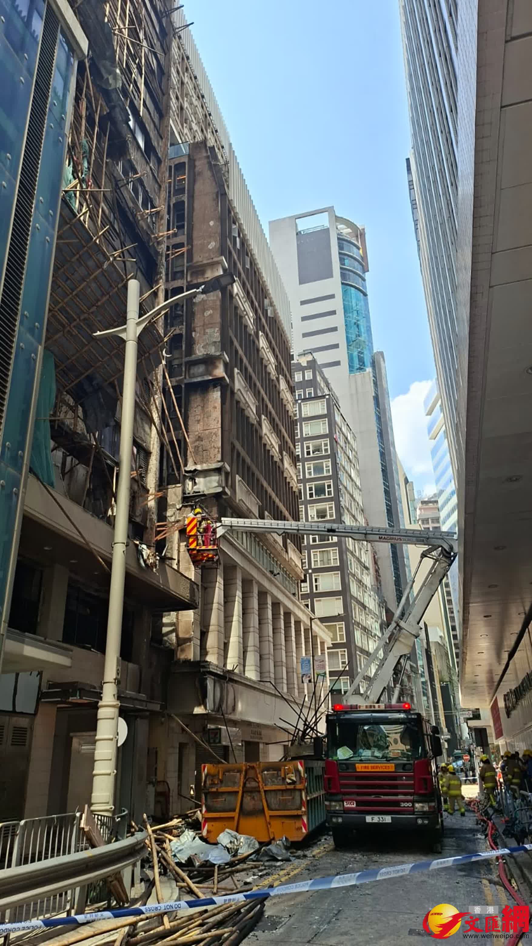 香港文匯報訊(記者 蕭景源)中環干諾道中華懋大廈昨日(18日)發生三級火,外牆多層大片棚架被焚,造成4人受傷送院,當中命危的姓倪(23歲)男傷者,今日(19日)晚上情況轉為嚴重,其餘2男1女(35至65歲)傷勢穩定。有專家指火勢猛烈及蔓延迅速,或與棚網並非由防燃物料製造有關。屋宇署則在昨夜和今早聯同工程項目人員視察了肇事大廈的外圍及內部情況後,認為樓宇結構無明顯危險,但將調查棚架所用的棚網(保護網)是否合規。