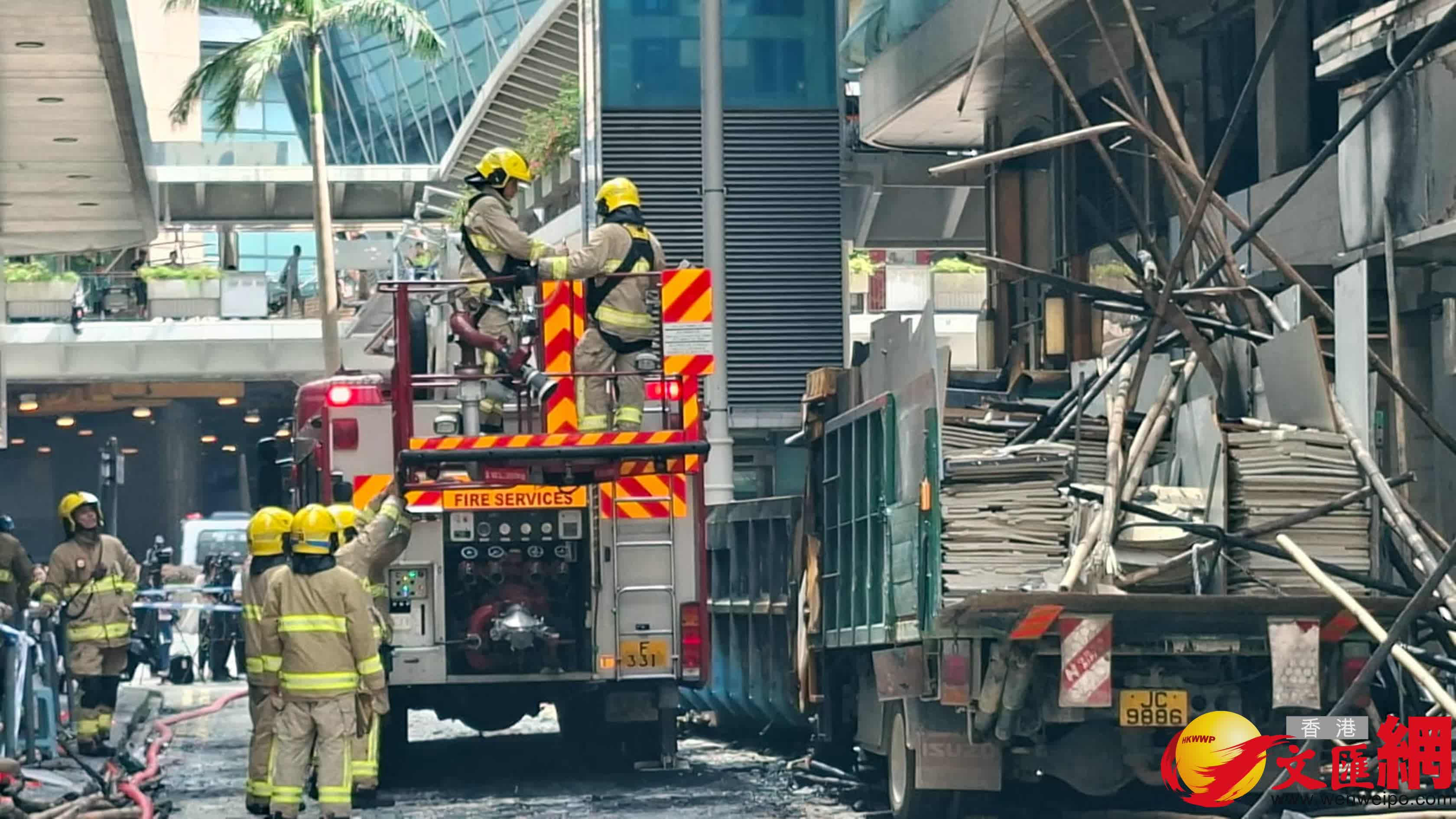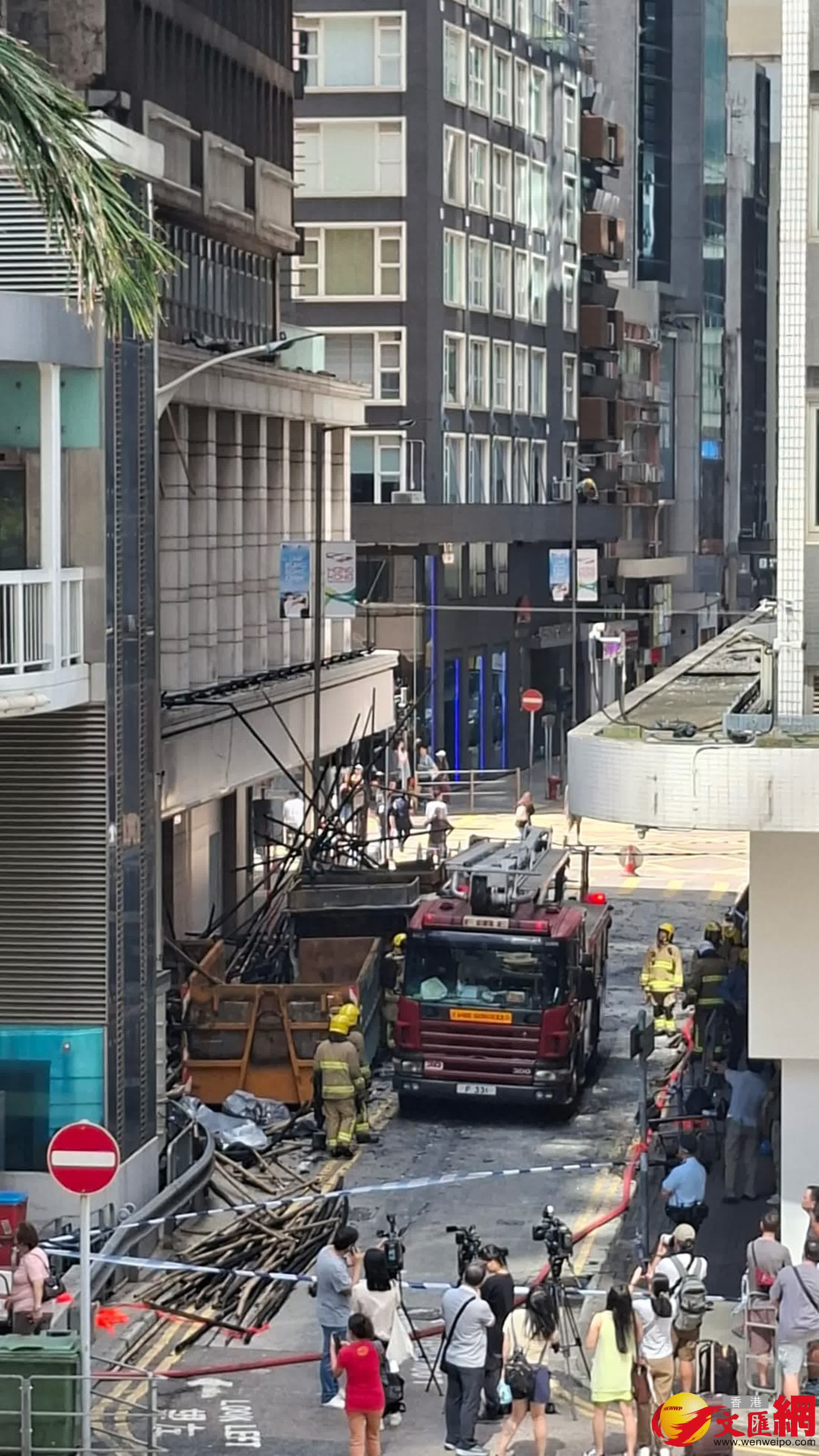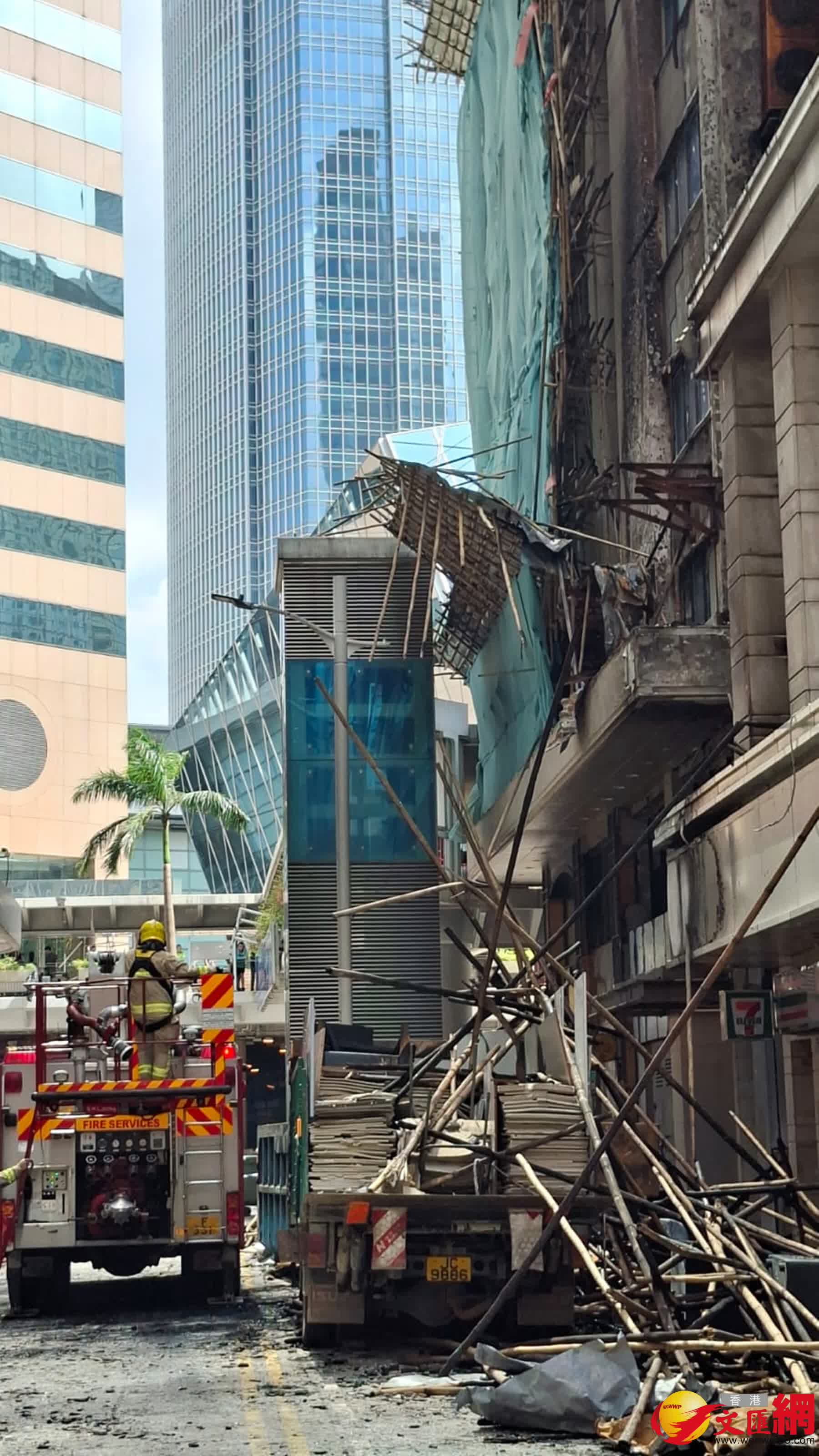 火警現場為中環干諾道中34至37號華懋大廈,上址外牆搭有棚架正進行維修工程。昨日下午4時24分,上址外牆棚架發生火警,火乘風勢迅速蔓延,消防接報後4分鐘到場,惟現場多層棚架已整幅陷入火海,冒起大量濃煙,火屑亦影響到隔鄰大廈,地面一輛貨車和一個環保斗亦被波及,所幸大廈內部未受嚴重影響。