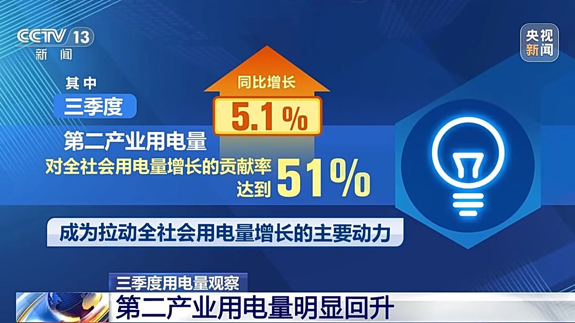 数据显示,前三季度,第二产业用电量4.91万亿千瓦时,其中,三季度,第二产业用电量同比增长5.1%,对全社会用电量增长的贡献率达到51%,成为拉动全社会用电量增长的主要动力。