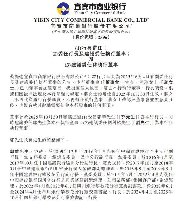 上述公告还显示,宜宾市商业银行董事会于2025年10月30日审议通过委任郭华为该行行长,同时建议委任郭华为该行执行董事。