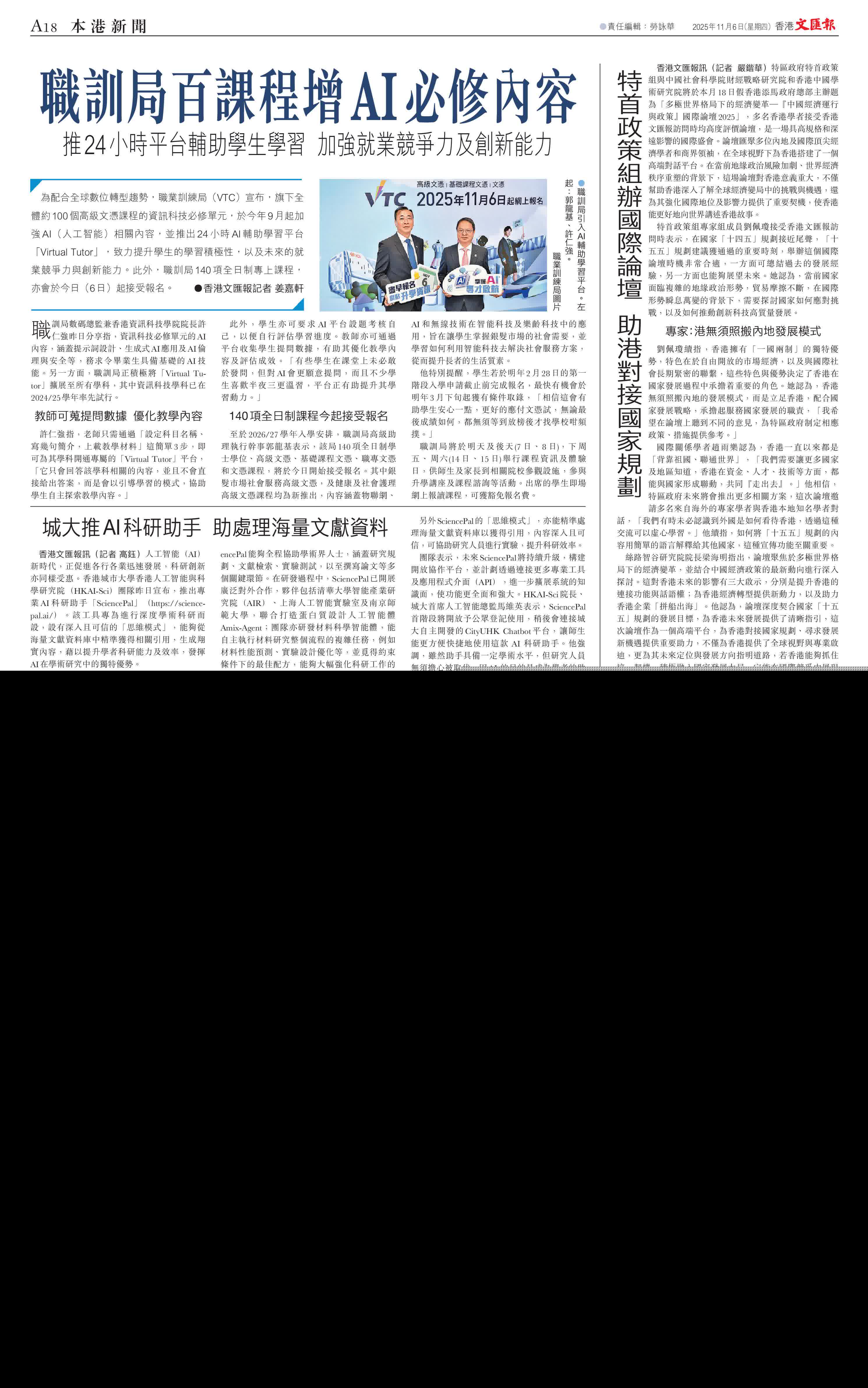 此外,學生亦可要求AI平台設題考核自己,以便自行評估學習進度。教師亦可通過平台收集學生提問數據,有助其優化教學內容及評估成效。「有些學生在課堂上未必敢於發問,但對AI會更願意提問,而且不少學生喜歡半夜三更溫習,平台正有助提升其學習動力。」