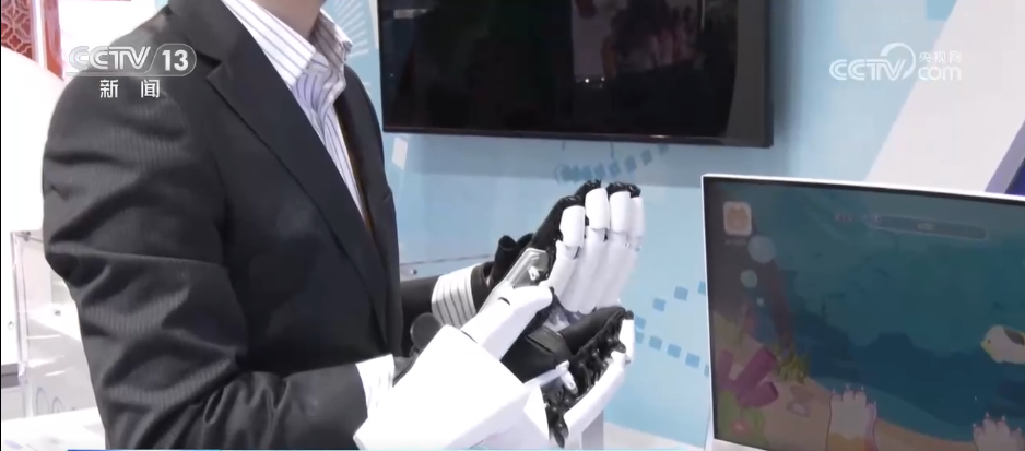 参展商:这是一个非侵入式脑机接口机器人,是帮助中风以后神经受损、偏瘫的患者进行神经康复。看到这个鱼漂过以后就产生运动意念,意念就可以控制这个手进行一次抓握。