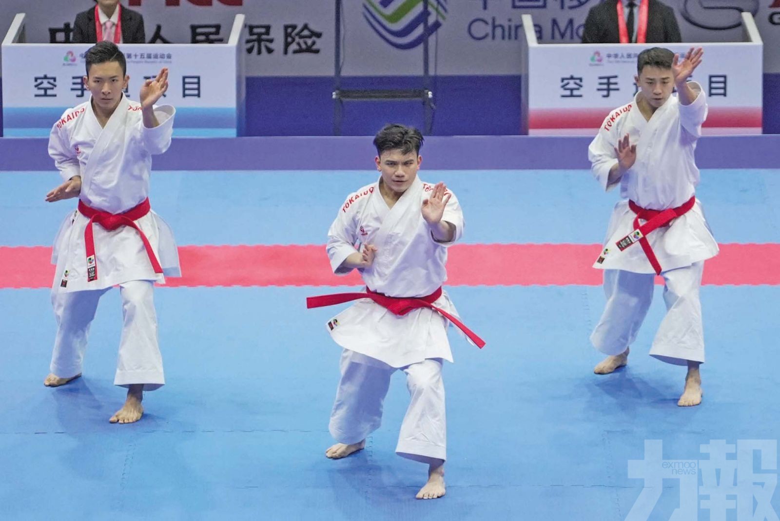 在澳門舉行的第十五屆全國運動會空手道男子業餘組團體型決賽中,澳門隊奪得冠軍。(新華社圖片)