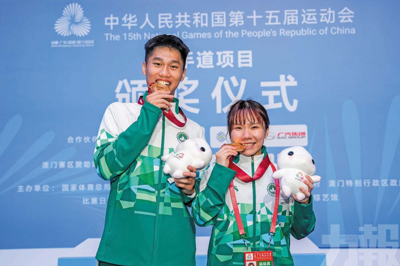 分獲第十五屆全國運動會群眾比賽空手道男子個人67公斤級和女子個人55公斤級冠軍的澳門隊選手容君灝(左)、方文慧在頒獎臺上合影。 (新華社圖片)