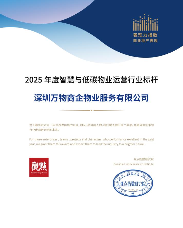 在当晚的表现力指数授牌典礼上,万物梁行凭借在智慧低碳领域的突出成就,荣获“2025年度商写物业服务企业榜首”、“2025年度智慧与低碳物业运营行业标杆”称号,不仅彰显公司作为智慧低碳的坚定实践者,更确立了在行业中标准推动者的地位。