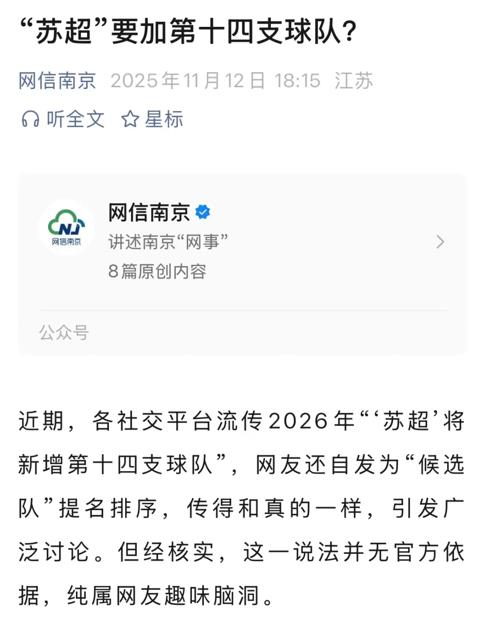 ·苏超要加第十四支球队?官方回应:纯属网友趣味脑洞。