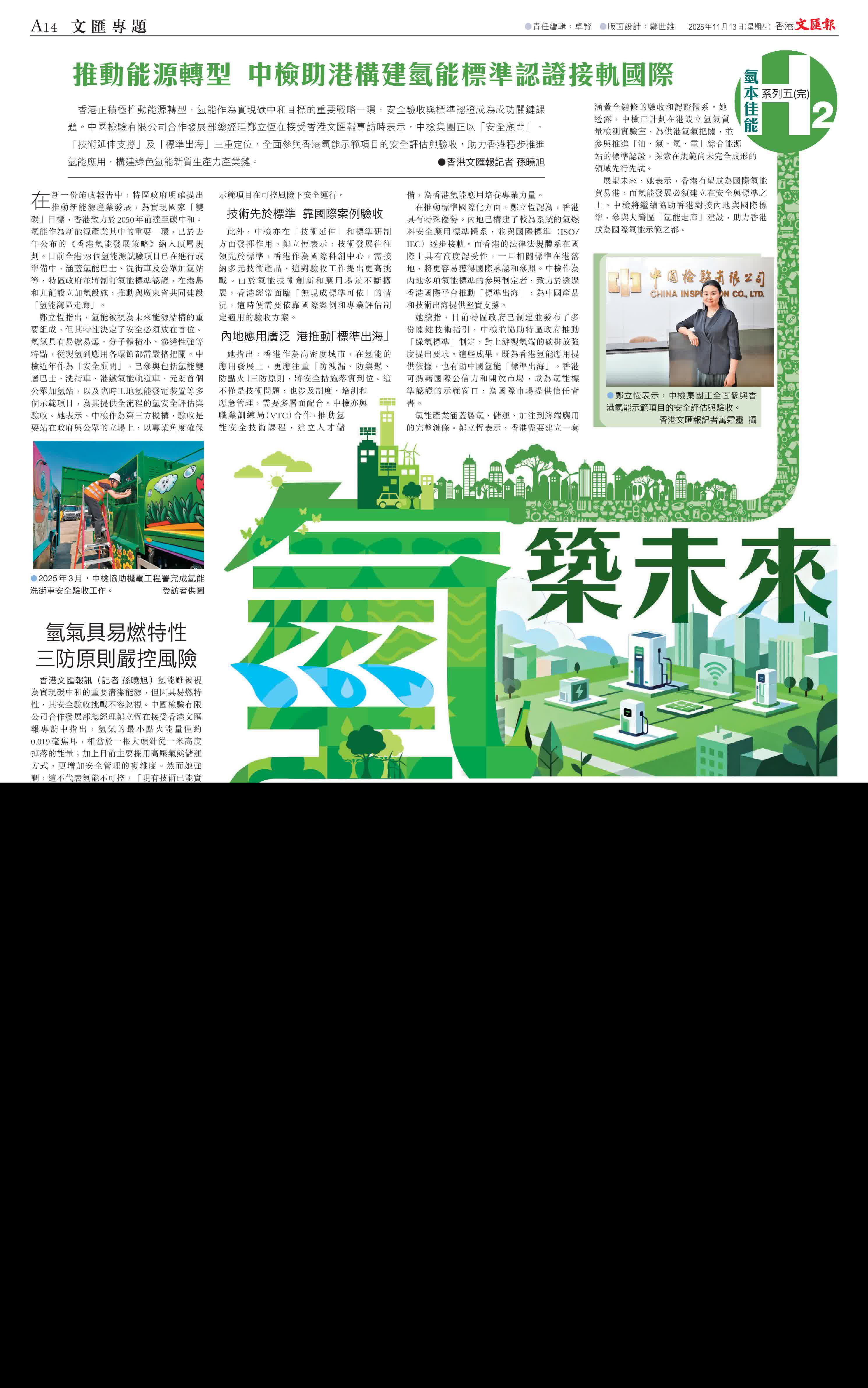 她續指,目前特區政府已制定並發布了多份關鍵技術指引,中檢並協助特區政府推動「綠氫標準」制定,對上游製氫端的碳排放強度提出要求。這些成果,既為香港氫能應用提供依據,也有助中國氫能「標準出海」。香港可憑藉國際公信力和開放市場,成為氫能標準認證的示範窗口,為國際市場提供信任背書。