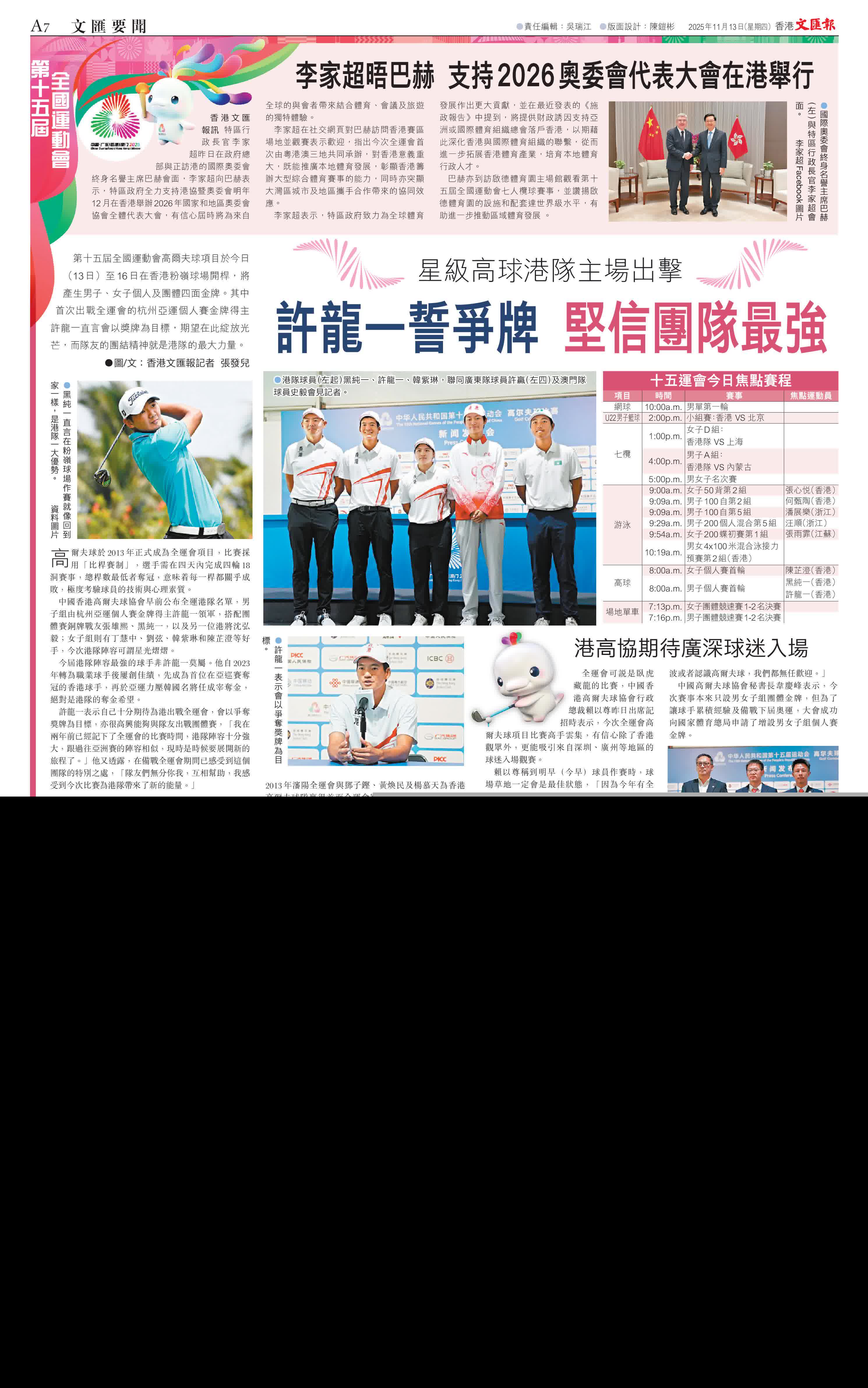 中國香港高爾夫球協會早前公布全運港隊名單,男子組由杭州亞運個人賽金牌得主許龍一領軍,搭配團體賽銅牌戰友張雄熙、黑純一,以及另一位港將沈弘毅;女子組則有丁慧中、劉弦、韓紫琳和陳芷澄等好手,今次港隊陣容可謂星光熠熠。