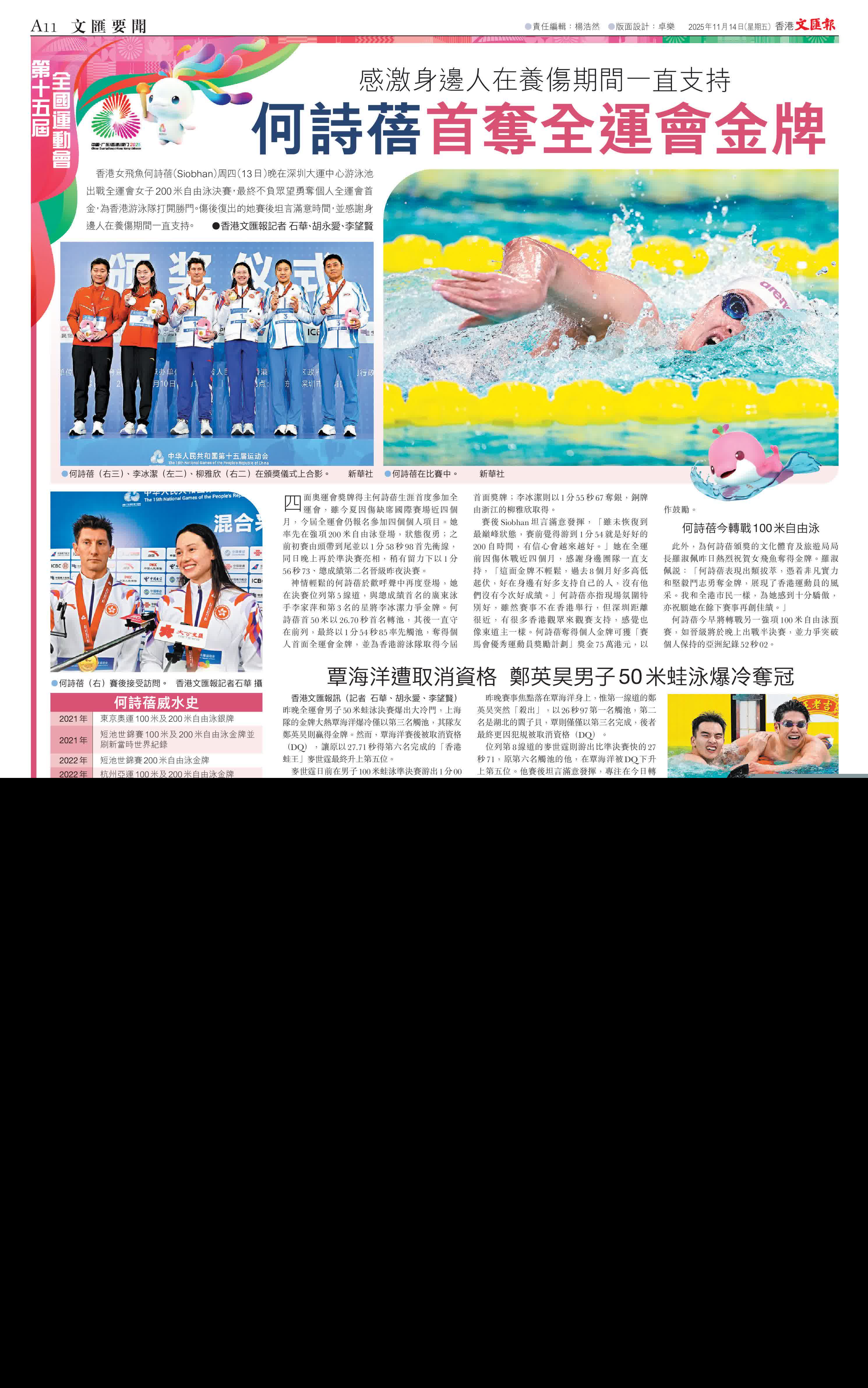 (香港文匯報記者 石華、胡永愛、李望賢)香港女飛魚何詩蓓(Siobhan)周四(13日)晚在深圳大運中心游泳池出戰全運會女子200米自由泳決賽,最終不負眾望勇奪個人全運會首金,為香港游泳隊打開勝門。傷後復出的她賽後坦言滿意時間,並感謝身邊人在養傷期間一直支持。