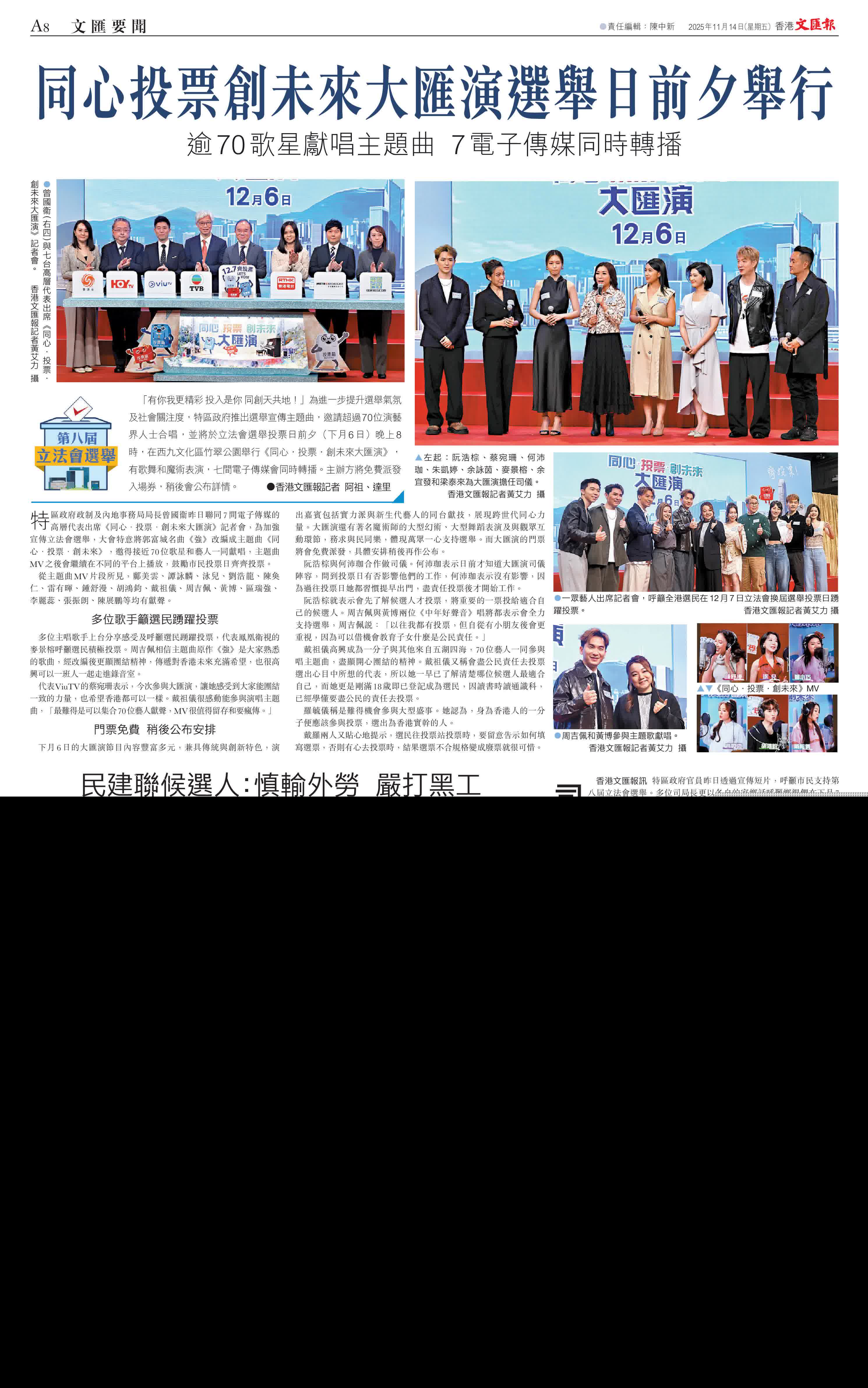 特區政府政制及內地事務局局長曾國衞昨日聯同7間電子傳媒的高層代表出席《同心·投票·創未來大匯演》記者會,為加強宣傳立法會選舉,大會特意將郭富城名曲《強》改編成主題曲《同心·投票·創未來》,邀得接近70位歌星和藝人一同獻唱,主題曲MV之後會繼續在不同的平台上播放,鼓勵市民投票日齊齊投票。