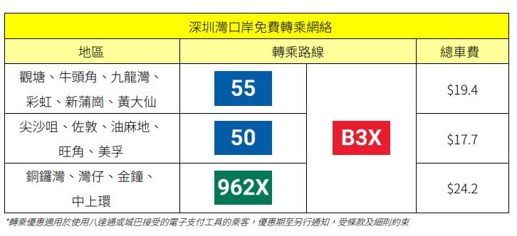 此外,城巴將強化深圳灣口岸的轉乘優惠,乘搭九龍東、油尖旺及港島區指定路線的乘客,將能享受轉乘 B3X 號線「口岸轉乘 免費一程」獨家優惠。