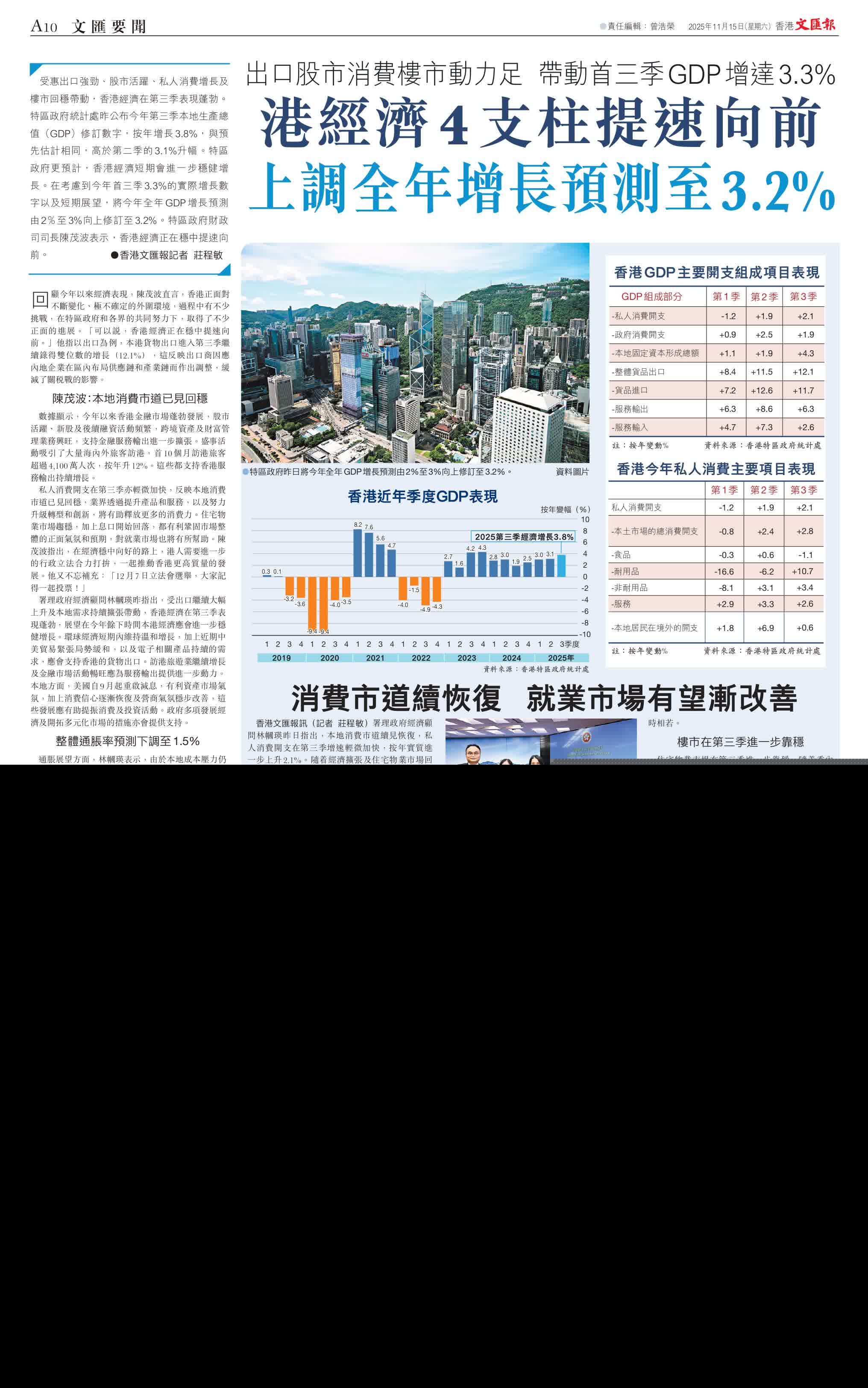 署理政府經濟顧問林幗瑛昨指出,受出口繼續大幅上升及本地需求持續擴張帶動,香港經濟在第三季表現蓬勃,展望在今年餘下時間本港經濟應會進一步穩健增長。環球經濟短期內維持溫和增長,加上近期中美貿易緊張局勢緩和,以及電子相關產品持續的需求,應會支持香港的貨物出口。訪港旅遊業繼續增長及金融市場活動暢旺應為服務輸出提供進一步動力。本地方面,美國自9月起重啟減息,有利資產市場氣氛,加上消費信心逐漸恢復及營商氣氛穩步改善,這些發展應有助提振消費及投資活動。政府多項發展經濟及開拓多元化市場的措施亦會提供支持。