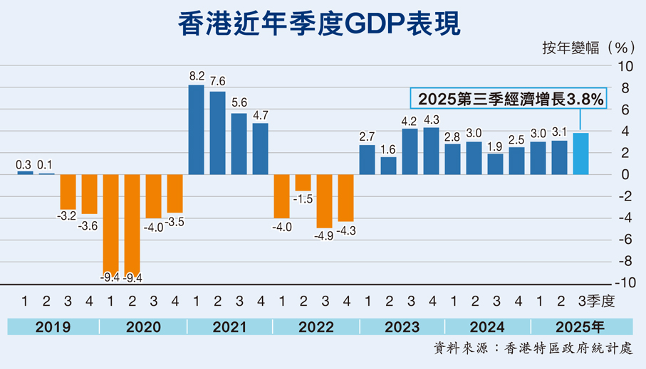 香港文匯報訊(記者 莊程敏)受惠出口強勁、股市活躍、私人消費增長及樓市回穩帶動,香港經濟在第三季表現蓬勃。特區政府統計處昨公布今年第三季本地生產總值(GDP)修訂數字,按年增長3.8%,與預先估計相同,高於第二季的3.1%升幅。特區政府更預計,香港經濟短期會進一步穩健增長。在考慮到今年首三季3.3%的實際增長數字以及短期展望,將今年全年GDP增長預測由2%至3%向上修訂至3.2%。特區政府財政司司長陳茂波表示,香港經濟正在穩中提速向前。