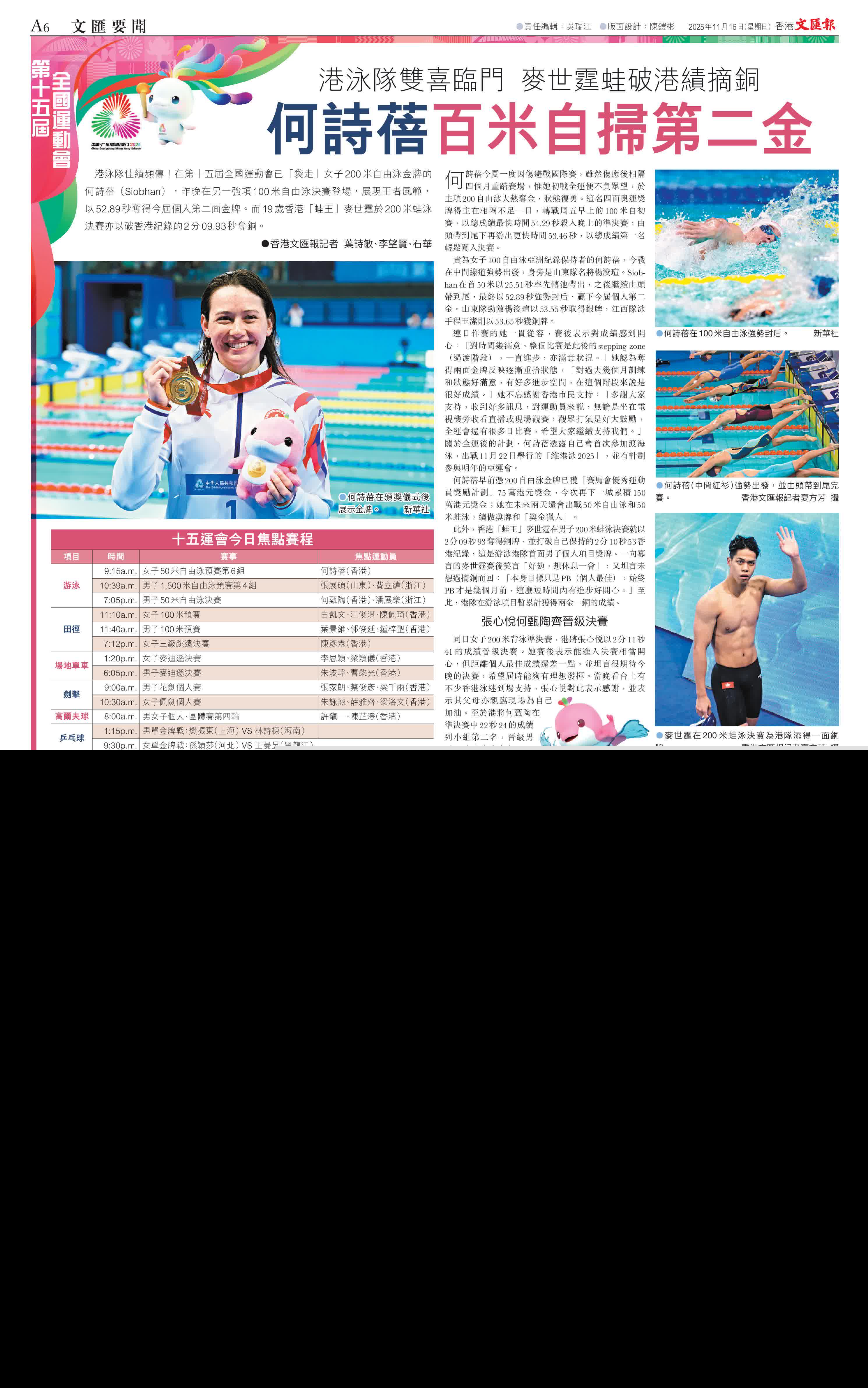 港泳隊佳績頻傳!在第十五屆全國運動會已「袋走」女子200米自由泳金牌的何詩蓓(Siobhan),昨晚在另一強項100米自由泳決賽登場,展現王者風範,以52.89秒奪得今屆個人第二面金牌。而19歲香港「蛙王」麥世霆於200米蛙泳決賽亦以破香港紀錄的2分09.93秒奪銅。
