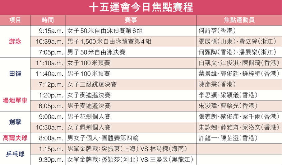 (香港文匯報記者 葉詩敏、李望賢、石華)何詩蓓今夏一度因傷避戰國際賽,雖然傷癒後相隔四個月重踏賽場,惟她初戰全運便不負眾望,於主項200自由泳大熱奪金,狀態復勇。這名四面奧運獎牌得主在相隔不足一日,轉戰周五早上的100米自初賽,以總成績最快時間54.29秒殺入晚上的準決賽,由頭帶到尾下再游出更快時間53.46秒,以總成績第一名輕鬆闖入決賽。