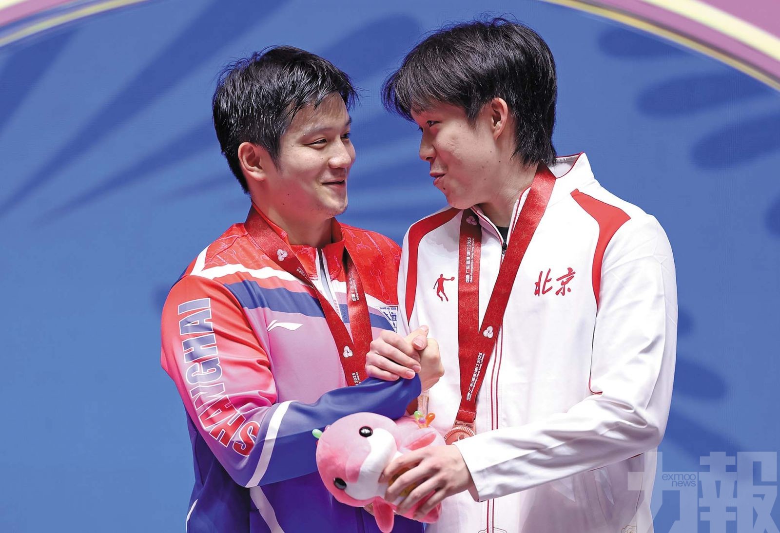 冠軍上海隊選手樊振東(左)與季軍北京隊選手王楚欽握手致意。(新華社圖片)