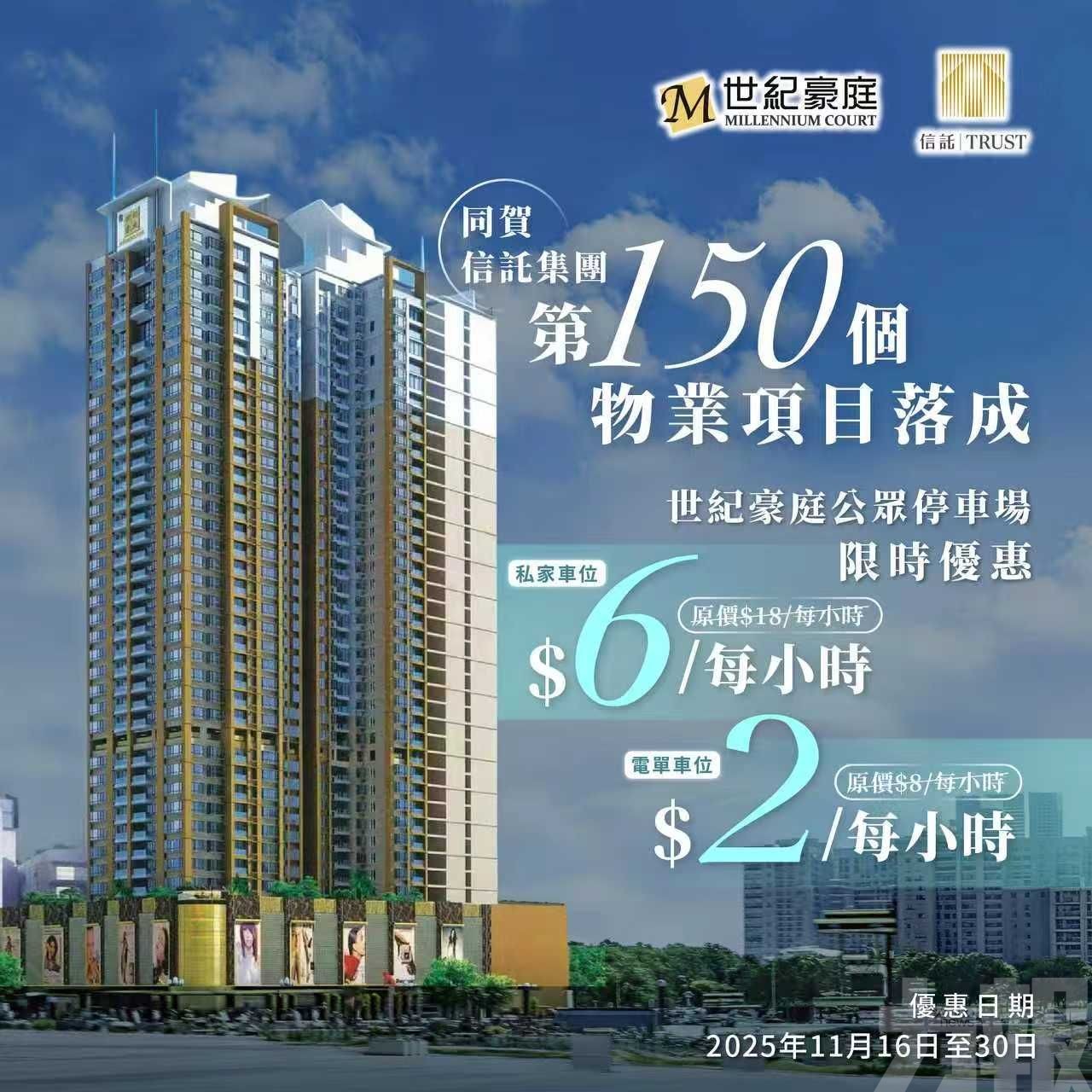 與此同時,為便利市民出行並減輕負擔,信託集團旗下「世紀豪庭公眾停車場」將於11月16日至11月30日期間,推出限時時租車位優惠。