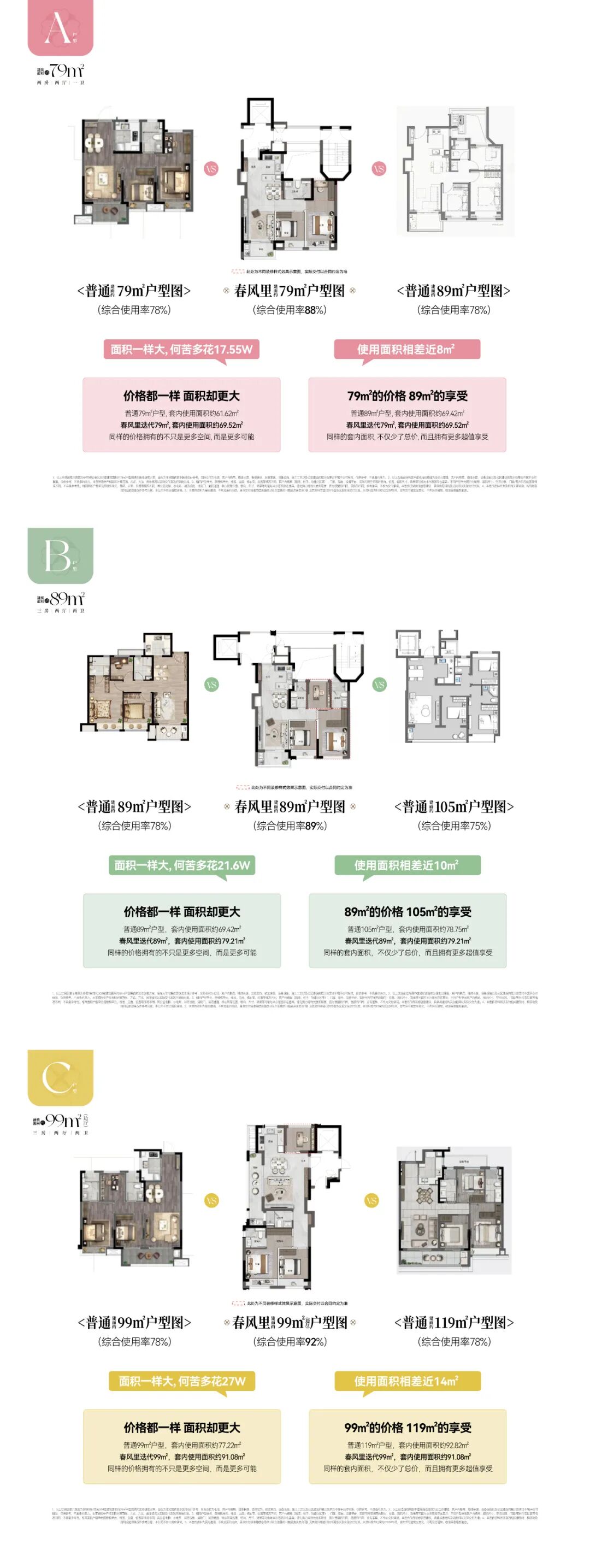 创新户型:79㎡折叠舱,以空间哲学重构生活维度户型设计是本次春风里产品的核心亮点。项目积极响应建筑新规,深度融合超维空间、创新S墙及LDK一体化设计等前沿理念,实现全户型平均约90%的超高使用率,远高于市场平均水平,为业主带来实实在在的空间价值提升。