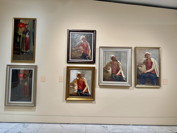 展览第三部分的第一板块“U字楼里的室内写生”,展出了两组课上写生练习,观众借此得以看到多个同学在同一节课上写生同一位模特的作品。其中一组是四幅由不同学员完成的课上写生作业,画面正中是一位裹着白色头巾的男性,身着红色背心和深蓝色裤子,披着白色外套,一只手搭在麻袋上,另一只手拿着一把锄头,轻搁在对侧的腿上。四幅画的角度有细微的差异,仿佛立体摄影的多重镜头,我们可以从中想象出画室中面对着模特展开画板的各位学员,在那样一个阳光充沛的日子,完成了一组可以彼此印证、互相解释的随堂练习。通过马克西莫夫老师的指导,他们接受结构、外光、构图乃至绘画性等富有体系性的基础教学,并在一次次的重复中获得成长。学员们面对相同的场景或模特,经由老师指导,对光线、色彩和形体塑造做出个人化的差异处理,最终形成独具特色的画面,这是集中训练和因材施教的共同体现,也成为学员们日后的创作中逐步发展出强烈的个人风格的起点。
