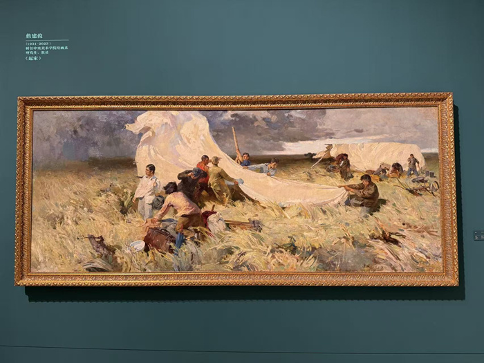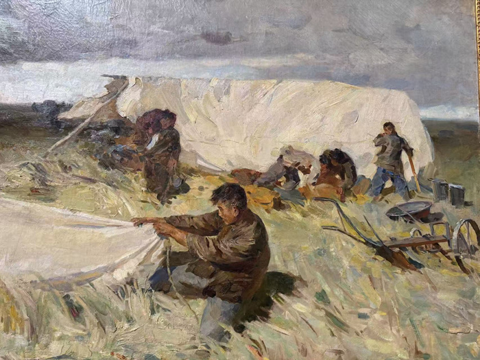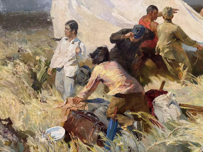 作为“马训班”最具感染力和代表性的作品之一,詹建俊的《起家》将时代命题与个人激情融为一体,在完美体现马克西莫夫倡导的科学创作流程、严谨造型规律的同时,对叙事方式和构图形式展开了更深入的个人思考。一来,比起同期描述历史事件或英雄人物作品多采用的直白叙事方式,詹建俊放弃了对“青年垦荒队”日常劳动的具体场景,而是捕捉了一个更戏剧性的瞬间:暴风雨来临之前,一群垦荒青年争分夺秒,与狂风分离搏斗,努力固定帐篷。这个场景的选择避免了刻板说教,将艰辛劳动与创业豪情浓缩为一个瞬间,将建设祖国的气魄以更为浪漫的视觉语言表达出来。二来,“S”形构图独具匠心,动感十足——拉扯帆布的人群和被风挂起的帐篷帆布,以点和面结合的方式引导了观众按弯曲的动线进行观看,仿佛感受到狂风呼啸和青年们的力量。这既是詹建俊对苏式油画中现实主义“戏剧瞬间”的沿袭,也是个人风格的充分发挥。