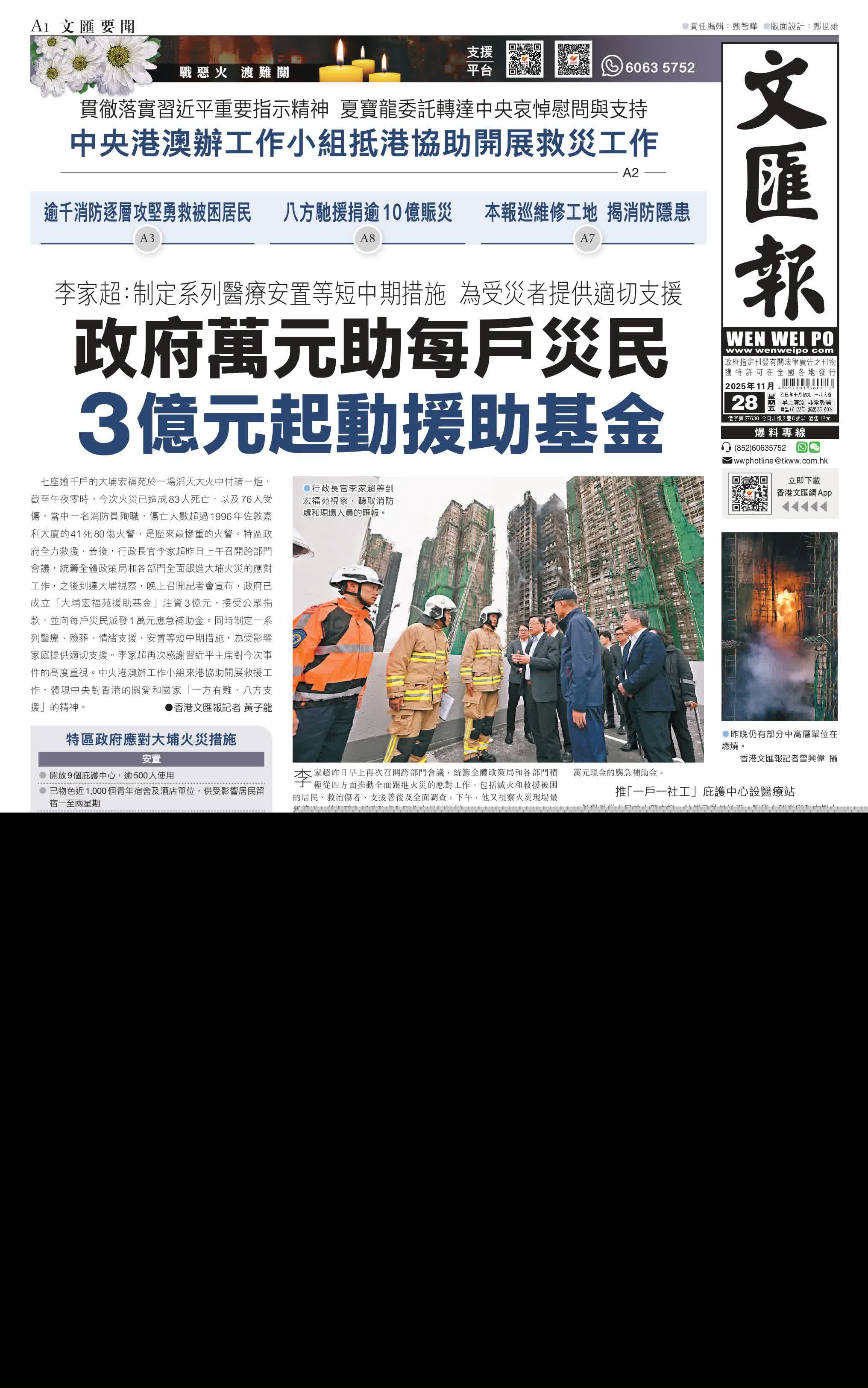 香港文匯報訊(記者 黃子龍)七座逾千戶的大埔宏福苑於一場滔天大火中付諸一炬,截至午夜零時,今次火災已造成83人死亡,以及76人受傷,當中一名消防員殉職,傷亡人數超過1996年佐敦嘉利大廈的41死80傷火警,是歷來最慘重的火警。特區政府全力救援、善後,行政長官李家超昨日上午召開跨部門會議,統籌全體政策局和各部門全面跟進大埔火災的應對工作,之後到達大埔視察,晚上召開記者會宣布,政府已成立「大埔宏福苑援助基金」注資3億元,接受公眾捐款,並向每戶災民派發1萬元應急補助金。同時制定一系列醫療、殮葬、情緒支援、安置等短中期措施,為受影響家庭提供適切支援。李家超再次感謝習近平主席對今次事件的高度重視。中央港澳辦工作小組來港協助開展救援工作,體現中央對香港的關愛和國家「一方有難、八方支援」的精神。