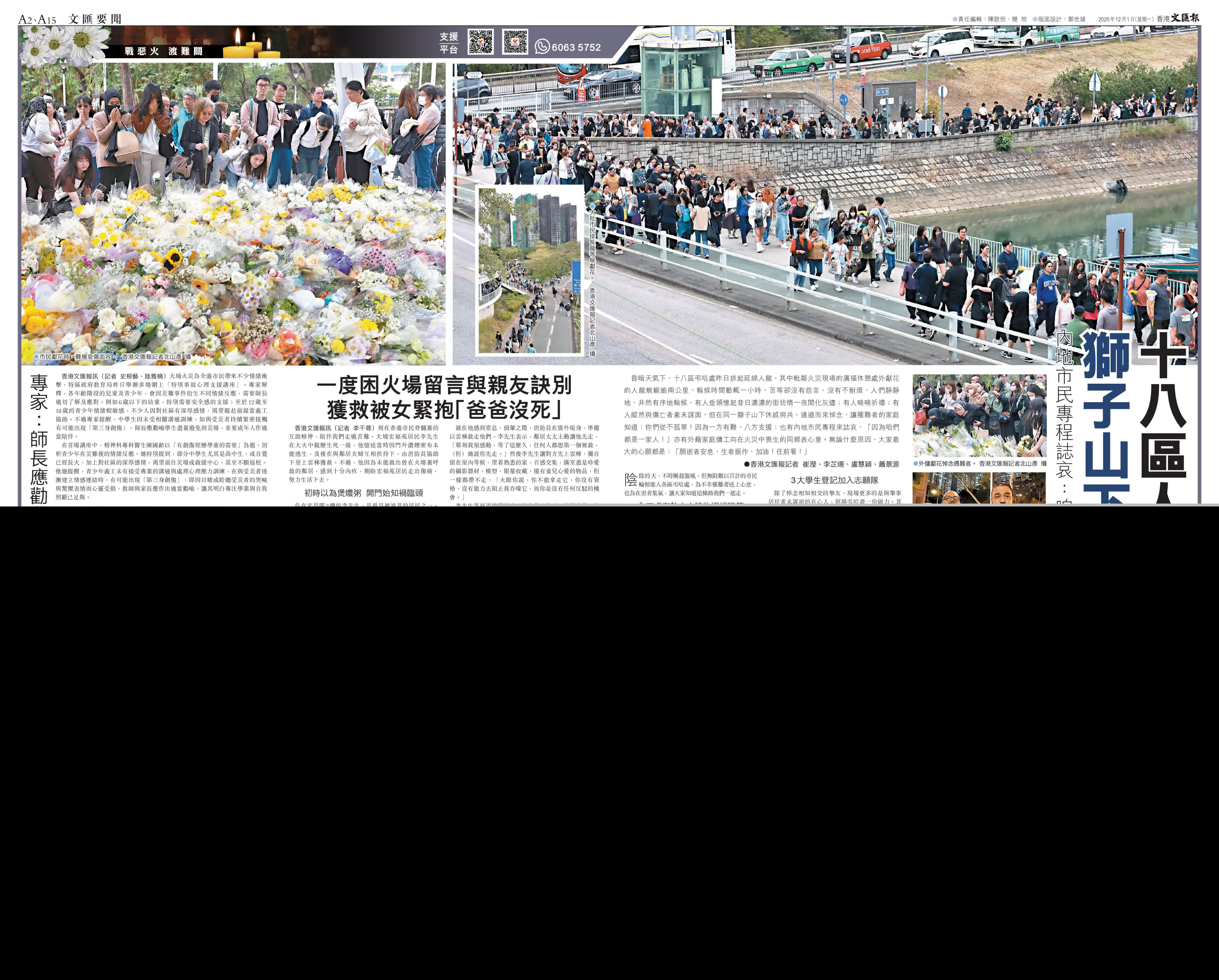 區內中學生李同學雖然未受火災影響停課,但他利用課餘時間加入義工隊伍,先後與同學拍攝紀錄片,記錄現場救援實況。片段所見,事發大廈部分樓層仍有濃煙與明火,消防隊員分區搜索、射水控火,醫護亦在附近待命。他將片段上載至社交平台,期望喚起更多關注與支援;帖文下亦有不少市民留言「Rest in Peace」,為逝者祈福。昨日他在父母的陪同下前來弔唁,希望能團結社會力量幫助有需要的人。