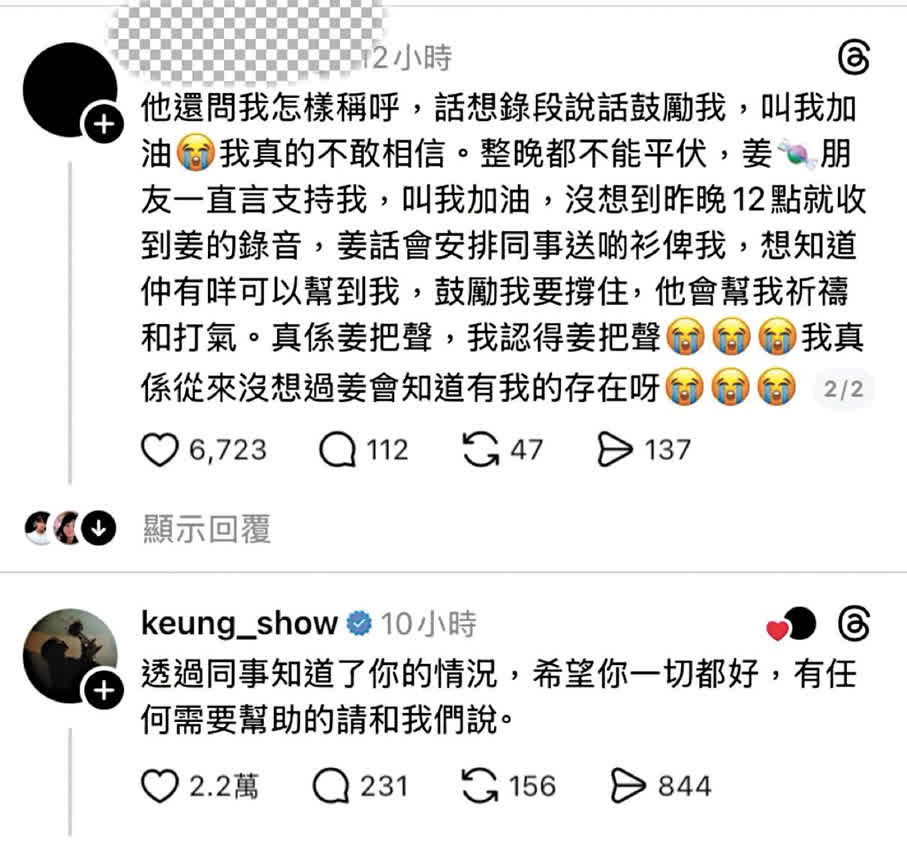 人氣偶像姜濤除與粉絲合共捐出130萬港元賑災外,有住在宏福苑的粉絲自揭收到姜濤本人的WhatsApp慰問。