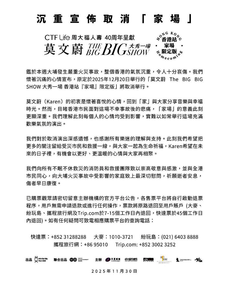 公告表示,鑑於大埔發生嚴重火災事故,整個香港的氣氛沉重,令人十分哀傷,理解此刻每個人的心情均受到影響,實難以如常舉行這場充滿歡樂氣氛的演出,懷着沉痛的心情宣布取消舉行演唱會。