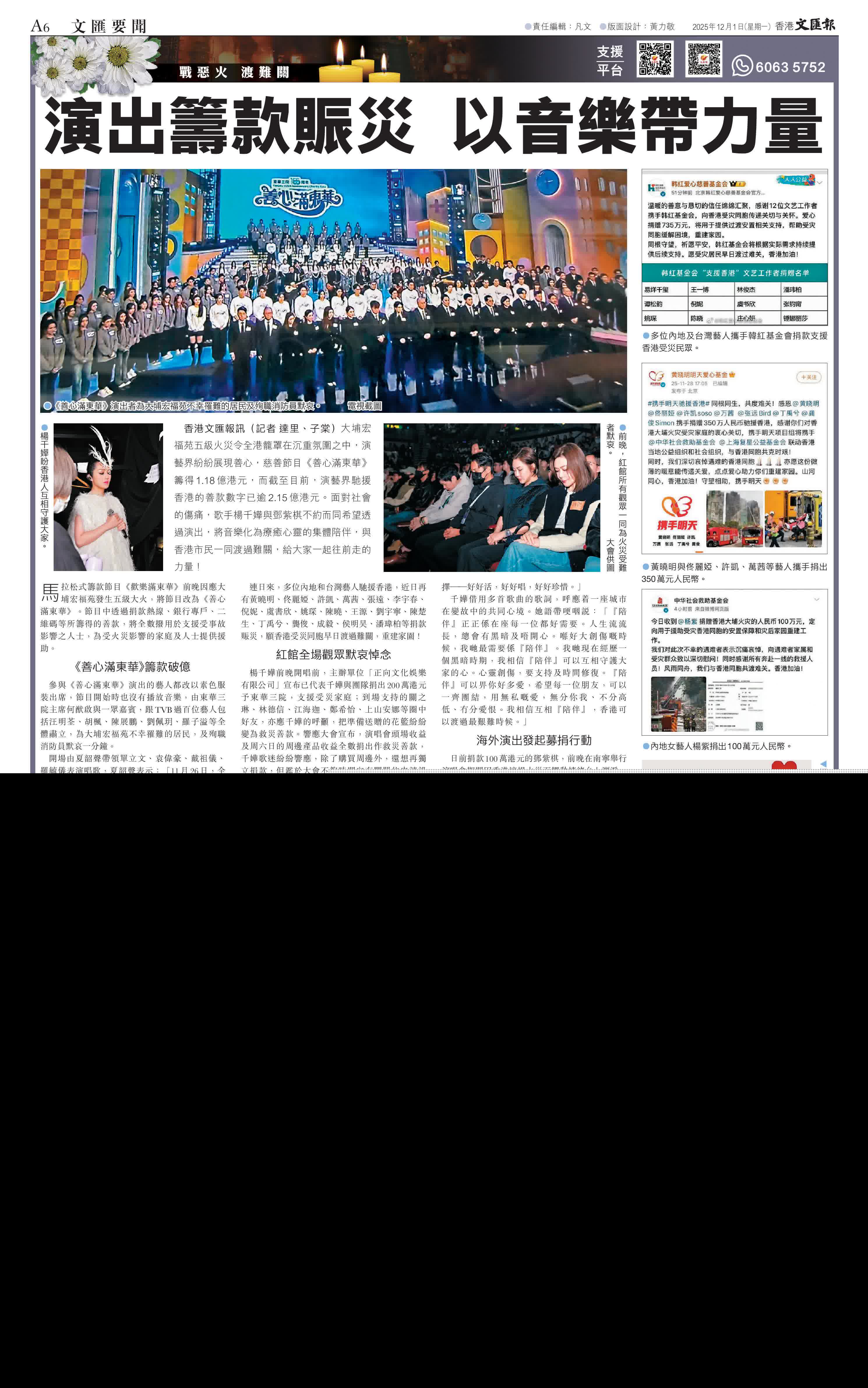 (香港文匯報記者 達里、子棠)大埔宏福苑五級火災令全港籠罩在沉重氛圍之中,演藝界紛紛展現善心,慈善節目《善心滿東華》籌得1.18億港元,而截至目前,演藝界馳援香港的善款數字已逾2.15億港元。面對社會的傷痛,歌手楊千嬅與鄧紫棋不約而同希望透過演出,將音樂化為療癒心靈的集體陪伴,與香港市民一同渡過難關,給大家一起往前走的力量!
