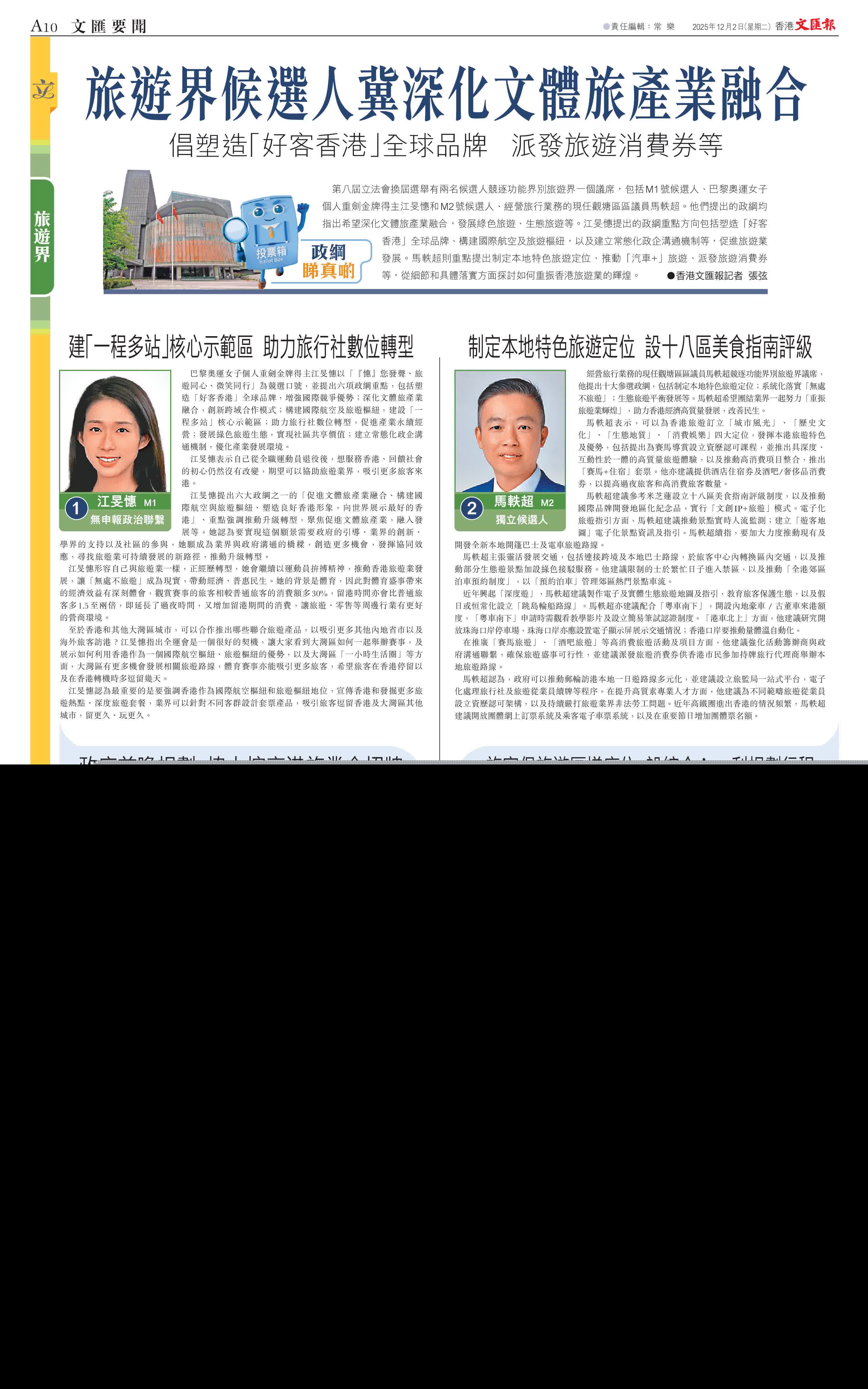 (香港文匯報記者 張弦)第八屆立法會換屆選舉有兩名候選人競逐功能界別旅遊界一個議席,包括M1號候選人、巴黎奧運女子個人重劍金牌得主江旻憓和M2號候選人、經營旅行業務的現任觀塘區區議員馬軼超。他們提出的政綱均指出希望深化文體旅產業融合,發展綠色旅遊、生態旅遊等。江旻憓提出的政綱重點方向包括塑造「好客香港」全球品牌、構建國際航空及旅遊樞紐,以及建立常態化政企溝通機制等,促進旅遊業發展。馬軼超則重點提出制定本地特色旅遊定位、推動「汽車+」旅遊、派發旅遊消費券等,從細節和具體落實方面探討如何重振香港旅遊業的輝煌。