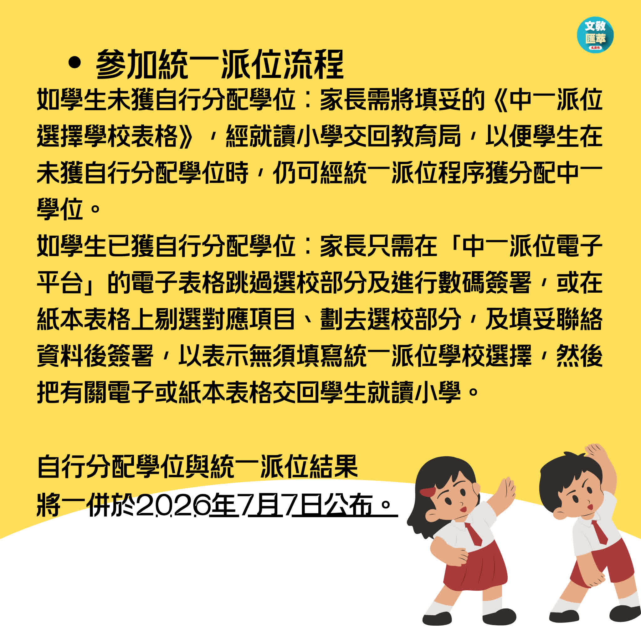 香港文匯報訊(記者 莫楠、編輯 文鯉)特區政府教育局早前發布公告,提醒參與2026年中學學位分配辦法(中一派位)的小六學生家長,如欲為子女申請官立、資助、按位津貼中學及參加派位的直資中學的自行分配學位,須於1月2日至16日期間向有關中學遞交申請。已登記為「中一派位電子平台」用戶並以「智方便+」綁定帳戶的家長,可於明日(5日)起透過電子平台瀏覽《中學概覽》提供的升中選校相關資訊,並於稍後時間遞交自行分配學位申請及查閱結果。自行分配學位階段的派位結果將於7月7日與統一派位結果一併公布。