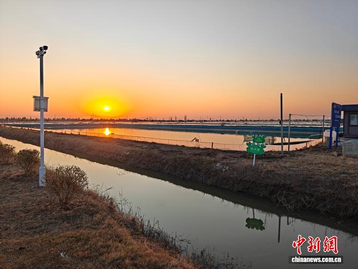 夕阳下的江苏省淮安市洪泽湖大闸蟹产业园。据介绍,蟹塘边的监控设备可实时收集水质等数据,实现智能化养殖。程小路 摄