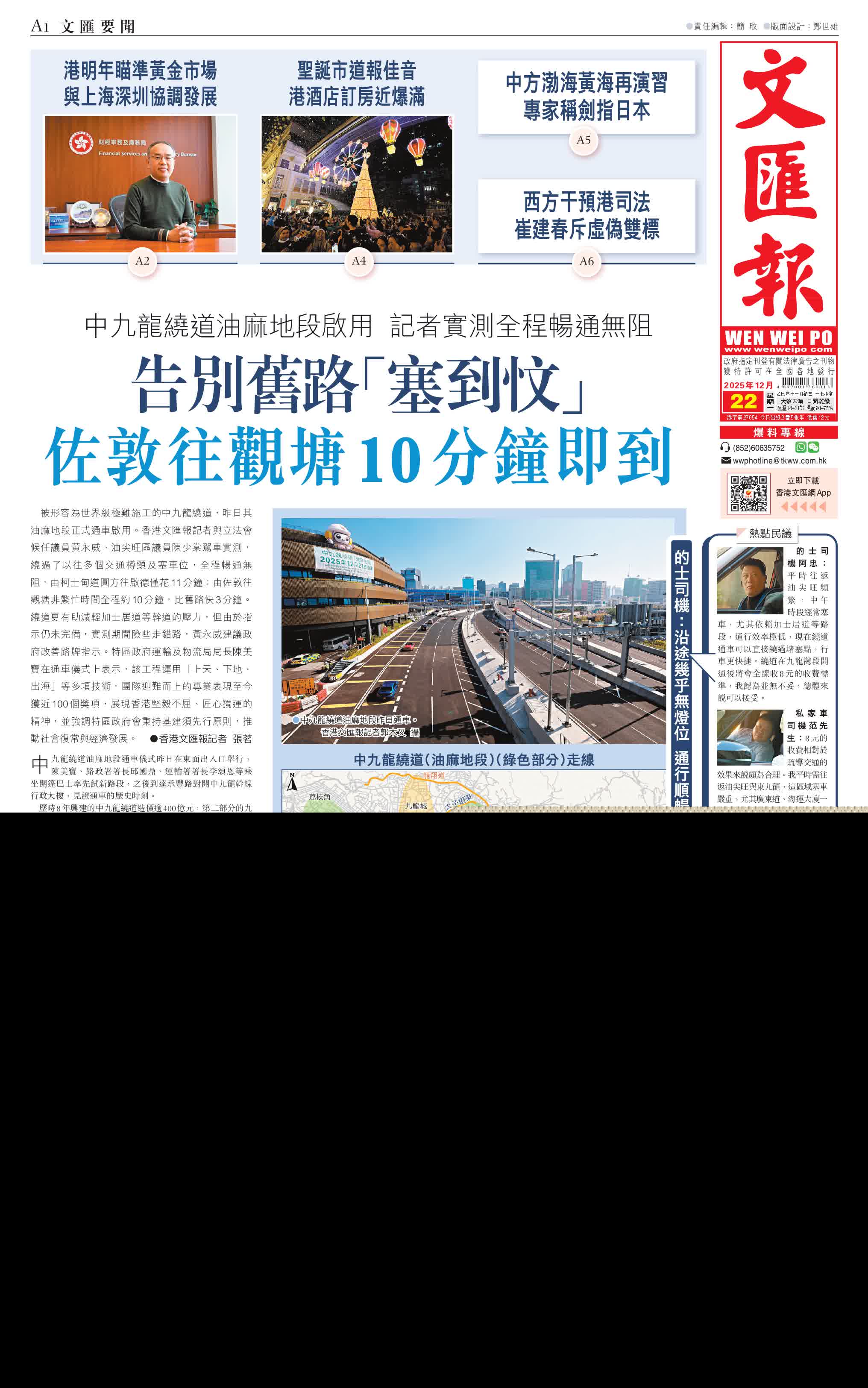 香港文匯報訊(記者 張茗)被形容為世界級極難施工的中九龍繞道,昨日其油麻地段正式通車啟用。香港文匯報記者與立法會候任議員黃永威、油尖旺區議員陳少棠駕車實測,繞過了以往多個交通樽頸及塞車位,全程暢通無阻,由柯士甸道圓方往啟德僅花11分鐘;由佐敦往觀塘非繁忙時間全程約10分鐘,比舊路快3分鐘。繞道更有助減輕加士居道等幹道的壓力,但由於指示仍未完備,實測期間險些走錯路,黃永威建議政府改善路牌指示。特區政府運輸及物流局局長陳美寶在通車儀式上表示,該工程運用「上天、下地、出海」等多項技術,團隊迎難而上的專業表現至今獲近100個獎項,展現香港堅毅不屈、匠心獨運的精神,並強調特區政府會秉持基建須先行原則,推動社會復常與經濟發展。