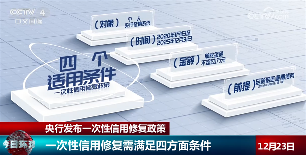 央视网消息:22日,中国人民银行发布通知,实施一次性信用修复政策。支持信用受损但积极还款的个人高效便捷重塑信用。哪些逾期信息可以适用一次性信用修复政策?又该如何修复呢?