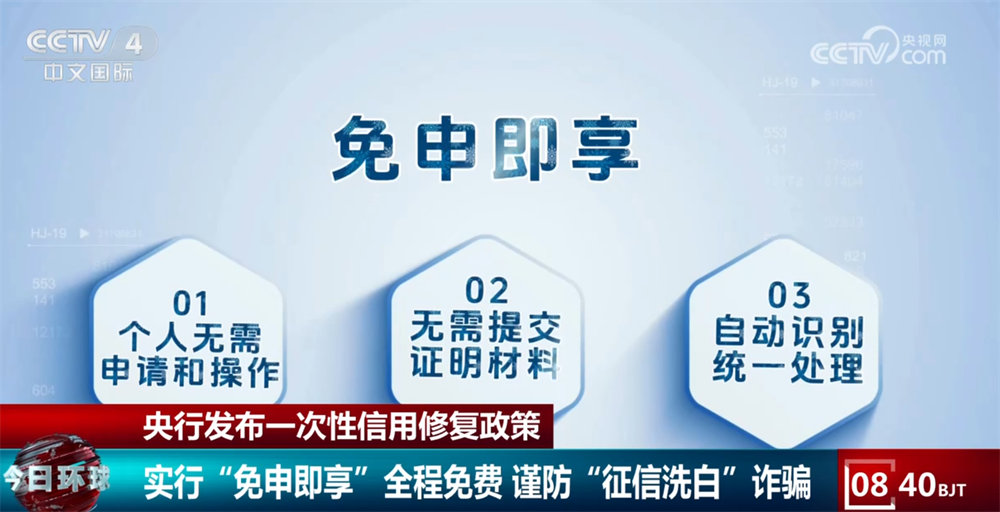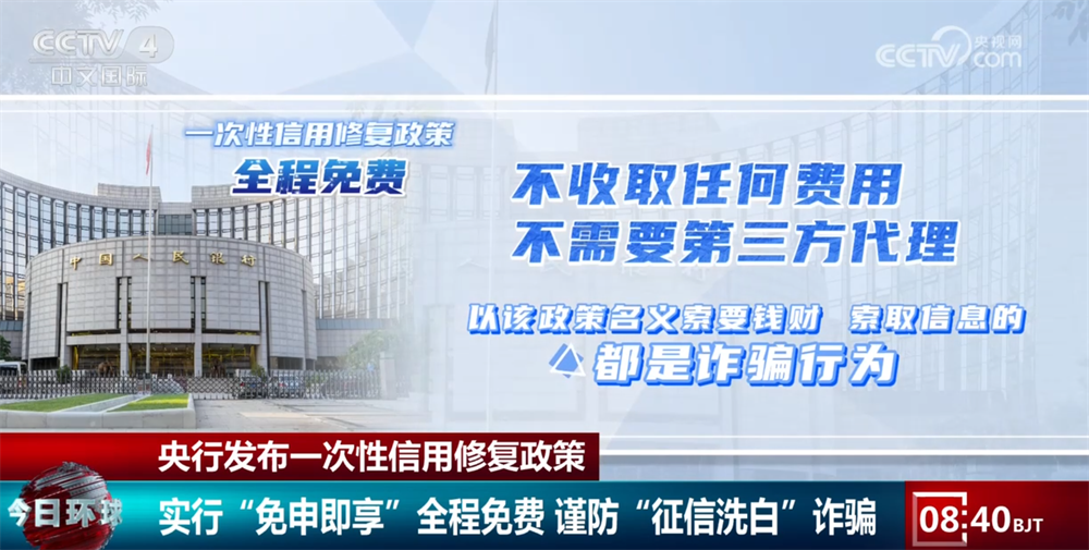 同时,一次性信用修复政策实行“免申即享”,个人无需申请和操作,也无需提交证明材料,由央行征信系统对符合条件的逾期信息进行自动识别和统一处理。央行提醒,一次性信用修复政策不收取任何费用、不需要第三方代理,任何以该政策名义索要钱财、索取信息的都是诈骗行为。