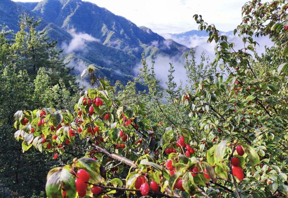 伏牛山是黄河、淮河、长江三大水系的分水岭,有“中原水塔”之称。山高林密,药材多,西峡县也因此有“天然药库”之名。山茱萸喜凉爽湿润,最适宜在海拔800—1200米的山岭生长,经历霜露,果实更显肉厚、油润,药性也更足。