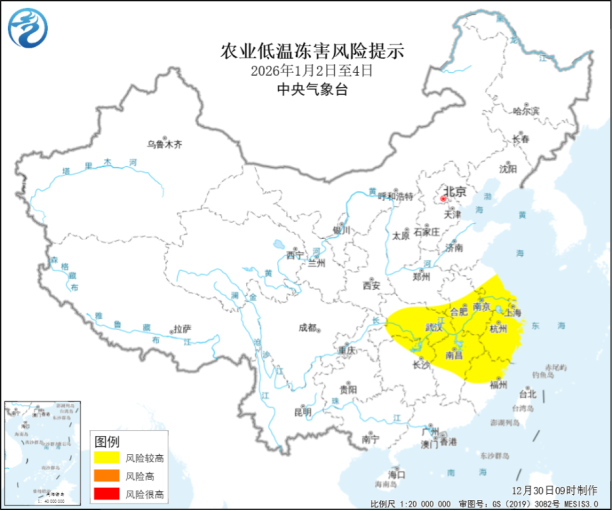 预计2025年12月30日夜间至2026年1月2日,中东部有大范围雨雪天气,江汉、黄淮西部、山西南部和陕西中南部等地的部分地区有大雪、局地暴雪;受强冷空气影响,长江中下游地区等地气温将下降6~8℃,浙江、湖北西部等地部分地区降幅达10℃以上,1月3日凌晨最低气温0℃线将南压至江南中南部一带,2—4日江苏中南部、安徽中南部、湖北大部、江西中北部、浙江、福建北部等地油菜、露地蔬菜和经济林果遭受低温冻害风险较高。建议:提前检查加固生产设施,抢收成熟果蔬,并采取覆盖保温、应急增温、喷施防冻剂等措施防范农业低温冻害。