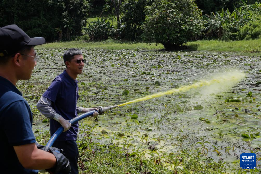 新年第一天的任务,是对村里一个水塘进行例行消杀和取样,看是否还能检查到水泡螺的踪迹。消杀设备被一件件搬下车,专家们换上水靴,与当地工人一起,按点位喷洒药剂。雨刚停,太阳又一次变得刺眼,没多久,几个人的后背已经被汗水浸透。