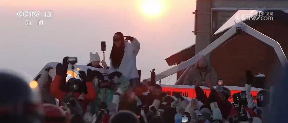 每当傍晚,山顶上还有很多雪友喜爱的“夕阳派对”,在太阳快落山的时候,穿着五颜六色滑雪服的雪友们会从四面八方汇聚到雪场的山顶上,大家一起看橙红色的夕阳慢慢落下,跟着现场音乐韵律,尽情欢呼跳跃,享受这份活力。