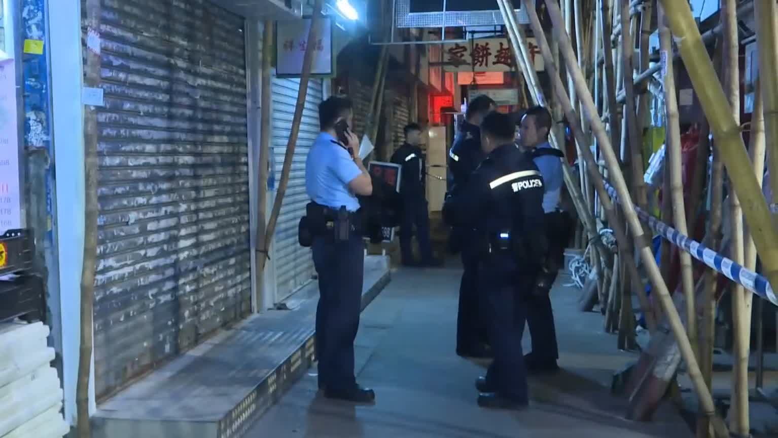 警員接報趕至調查,經搜查在弼街與通菜街交界截獲一名懷疑涉案男子,並在其附近地面檢獲一支鐵筆及鐵槌;警員將被捕男子黑布蒙頭及鎖上手銬押上警車帶署扣查,正追緝其餘在逃同黨。