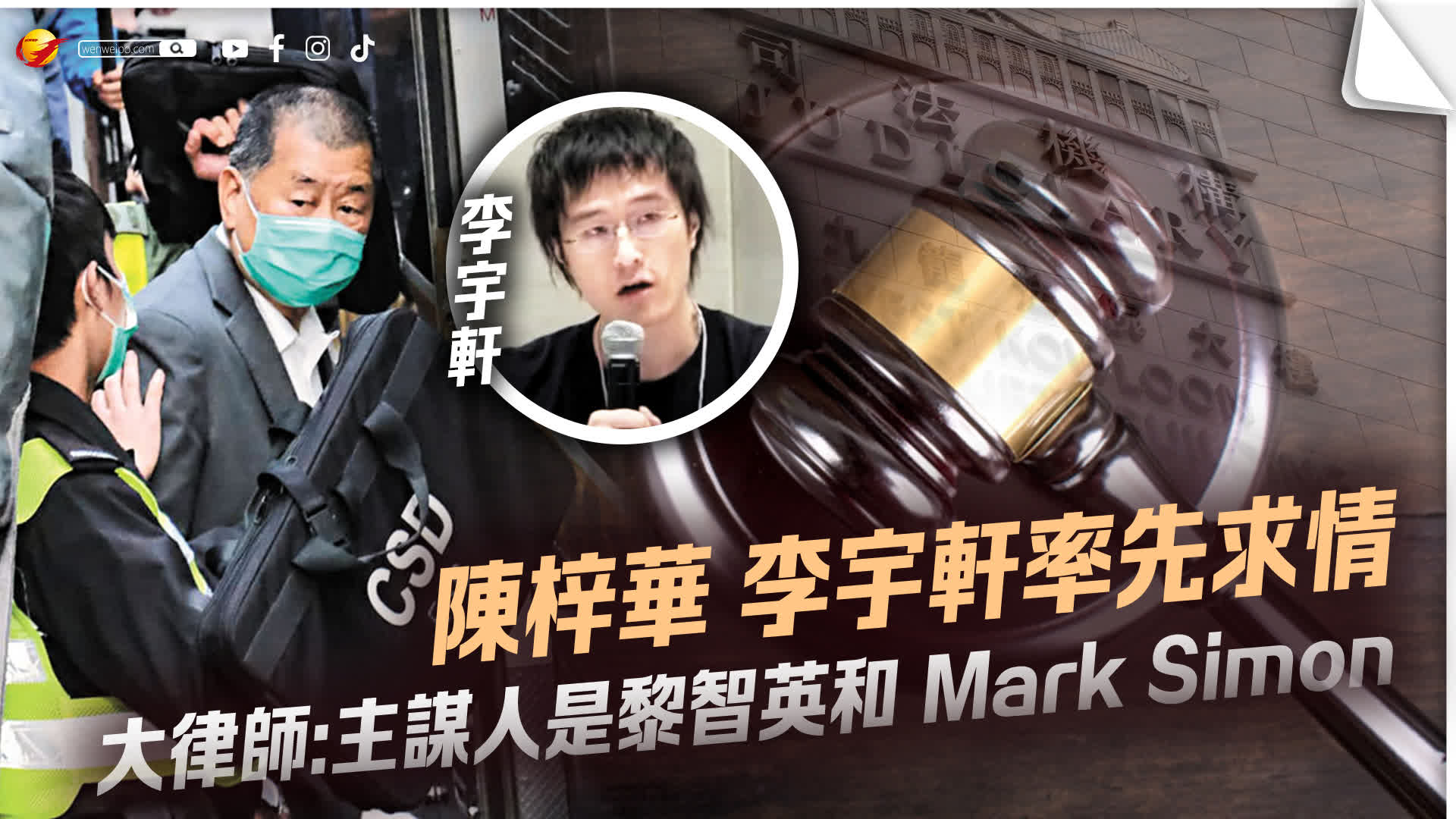 除黎智英及《蘋果日報》關聯公司外,另外8名被告包括已認罪的前壹傳媒行政總裁張劍虹、前《蘋果》副社長陳沛敏、總編輯羅偉光、執行總編輯林文宗、主筆馮偉光(盧峯)及楊清奇(李平)、「重光團隊」成員李宇軒及陳梓華。