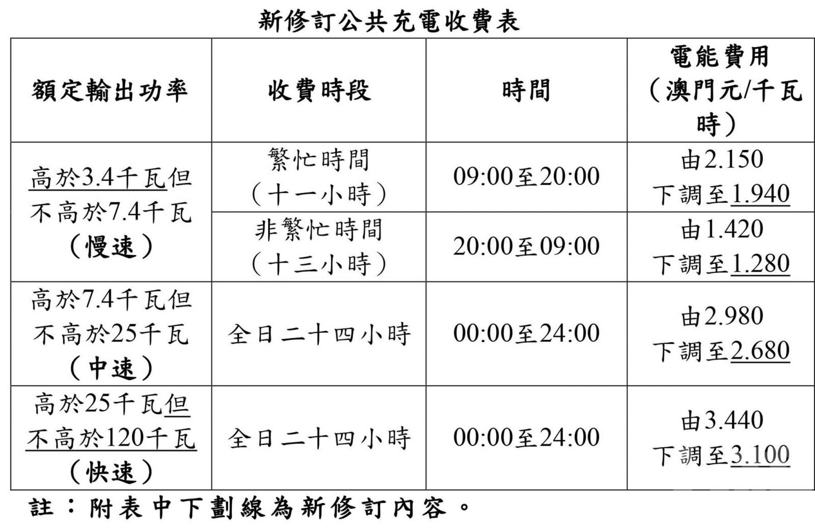 環境保護局昨(12)日發出新聞稿表示,為配合國家實現「雙碳」目標,貫徹持續完善綠色出行保障體系、進一步推廣使用電動車的施政方針,以及聽取社會意見和按照「澳門電動車推廣計劃」,特區政府透過第1/2026號行政長官批示,將運輸工具的公共充電收費下調約10%(見表格),將於2026年2月1日起生效。批示同時亦調整了慢充和快充的額定輸出功率。