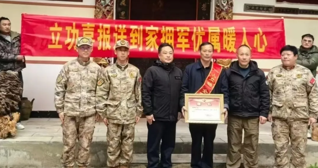 近日,云南省昭通市彝良县退役军人事务局与县人武部工作人员一同上门,将现役军人徐泽林的战备训练三等功喜报送到其家人手中,这已是徐泽林继2023年之后第二次获此荣誉。他的父亲徐洪刚身披绶带,接过这份沉甸甸的喜报,欣慰与自豪之情溢于言表。