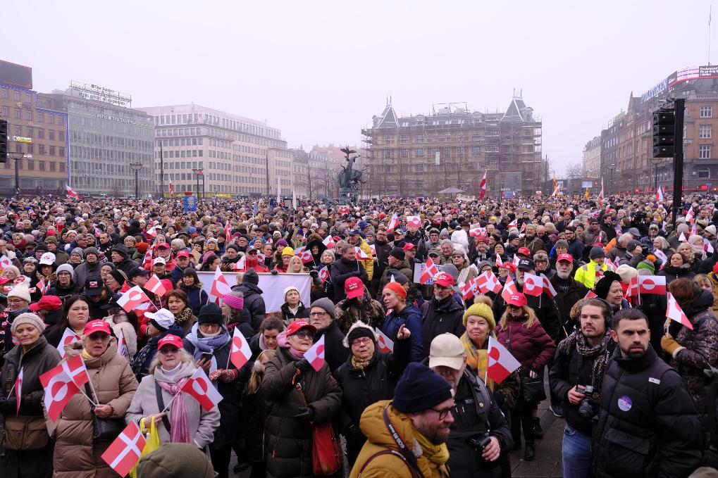 1月17日,人们在丹麦首都哥本哈根的市政厅广场参加游行示威。数千名丹麦人17日在首都哥本哈根举行游行示威,抗议美国企图控制格陵兰岛的行径。新华社记者张玉亮摄