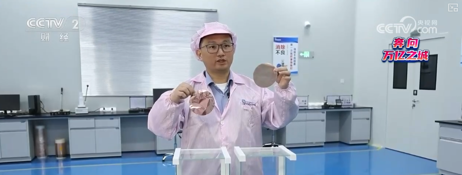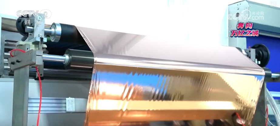 企业负责人夏建中介绍,左手边是一个6微米的传统铜箔,右手边是6微米的复合铜箔。传统铜箔大概是0.5克,复合铜箔大概是0.22克,重量只有传统铜箔的一半不到。