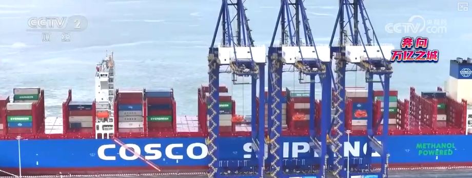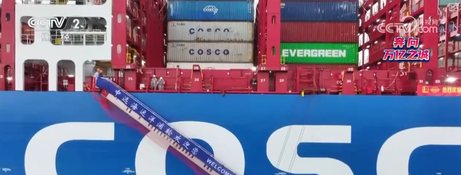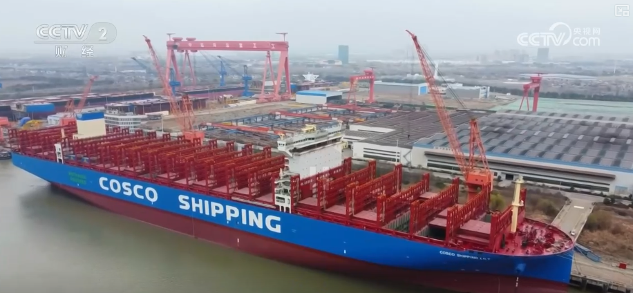 码头边停泊的这艘超大型船舶总长近400米、宽50余米,船体内工人们正在施工。这是中远海运建造的第4艘16000标准集装箱甲醇双燃料集装箱船。
