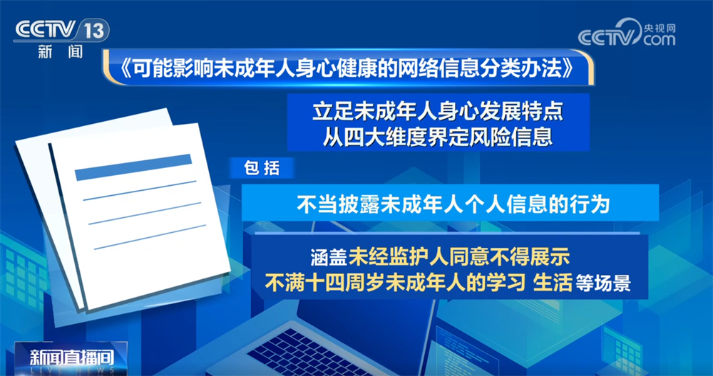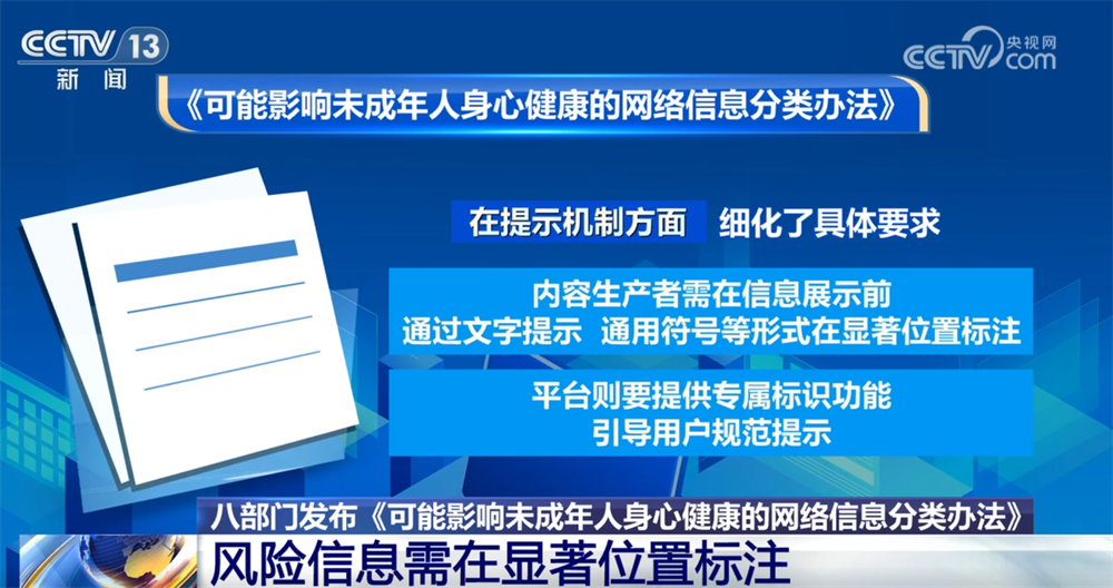 除了明确风险边界,《可能影响未成年人身心健康的网络信息分类办法》更对网络平台和内容生产者提出刚性约束,从信息展示、算法推荐到提示标识等方面,构建全链条防护体系,以精细化治理守护未成年人网络空间。